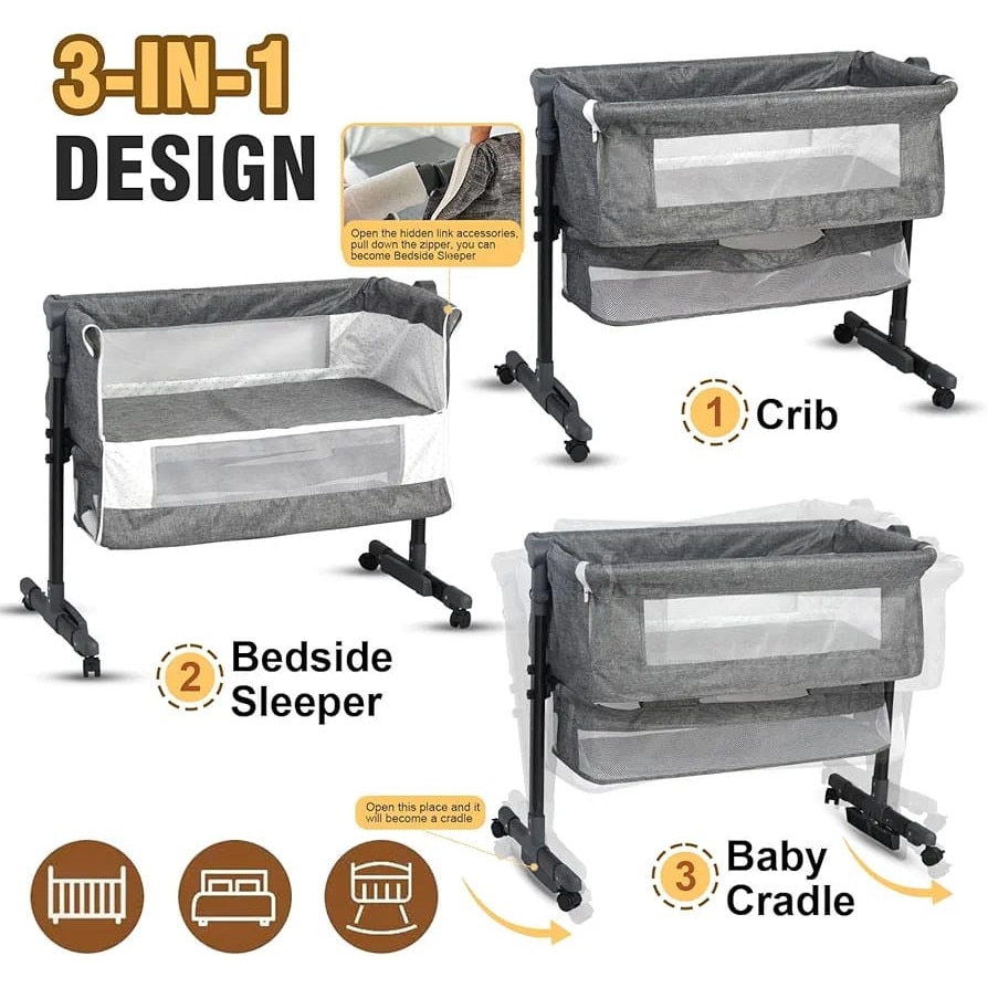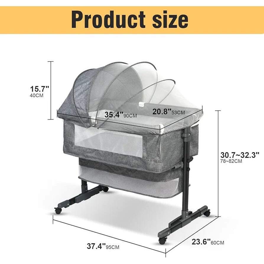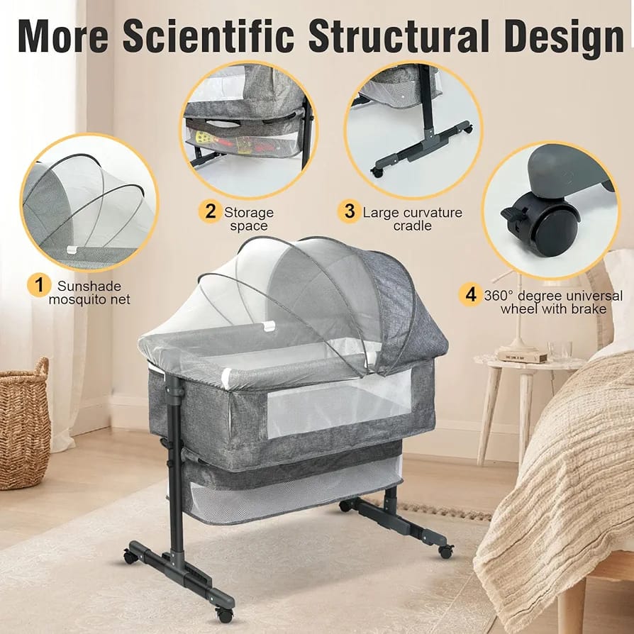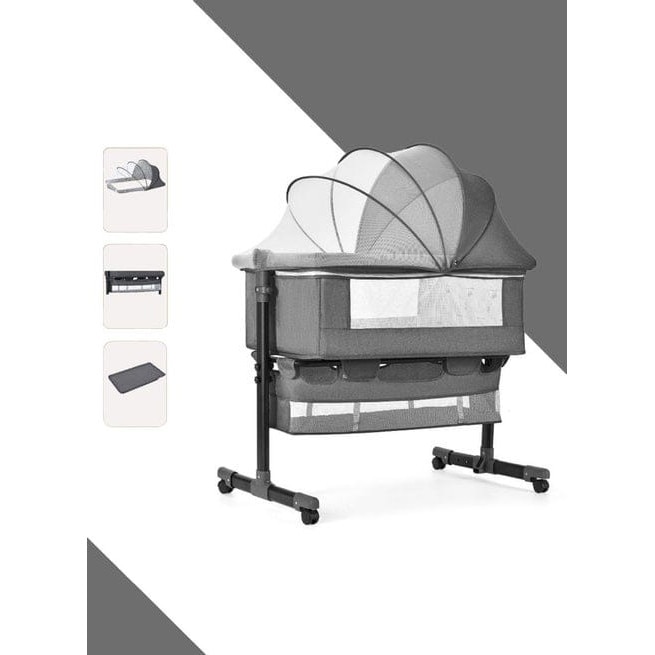 Patut Co-Sleeper Multifunctional 3 in 1, Inaltime Reglabila, Functie Anti-Reflux, Pliabil, Roti cu Blocare, Cos Depozitare si Plasa Anti-Tantari, 0-12 luni, Khaki/Light Grey/Dark Grey