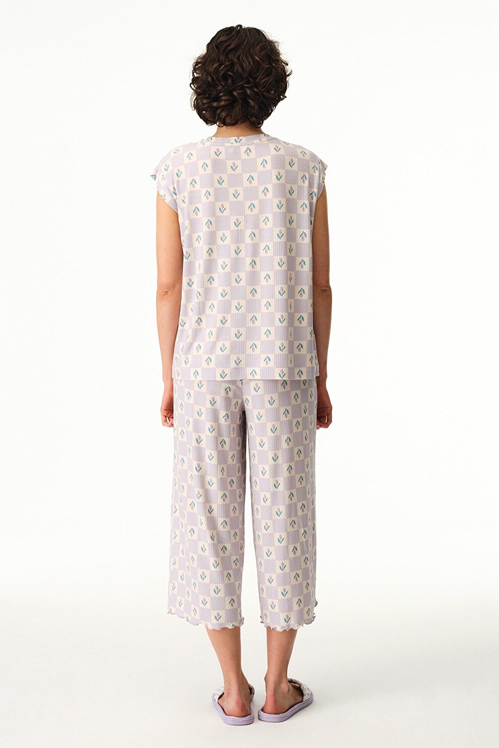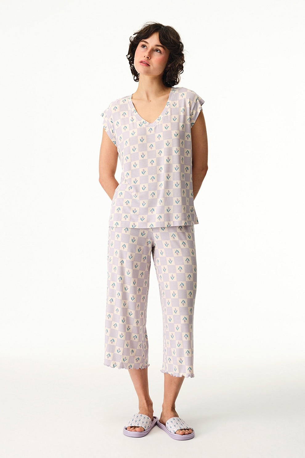 Penti - Pijama crop de pijama cu model, Violet deschis/Bej