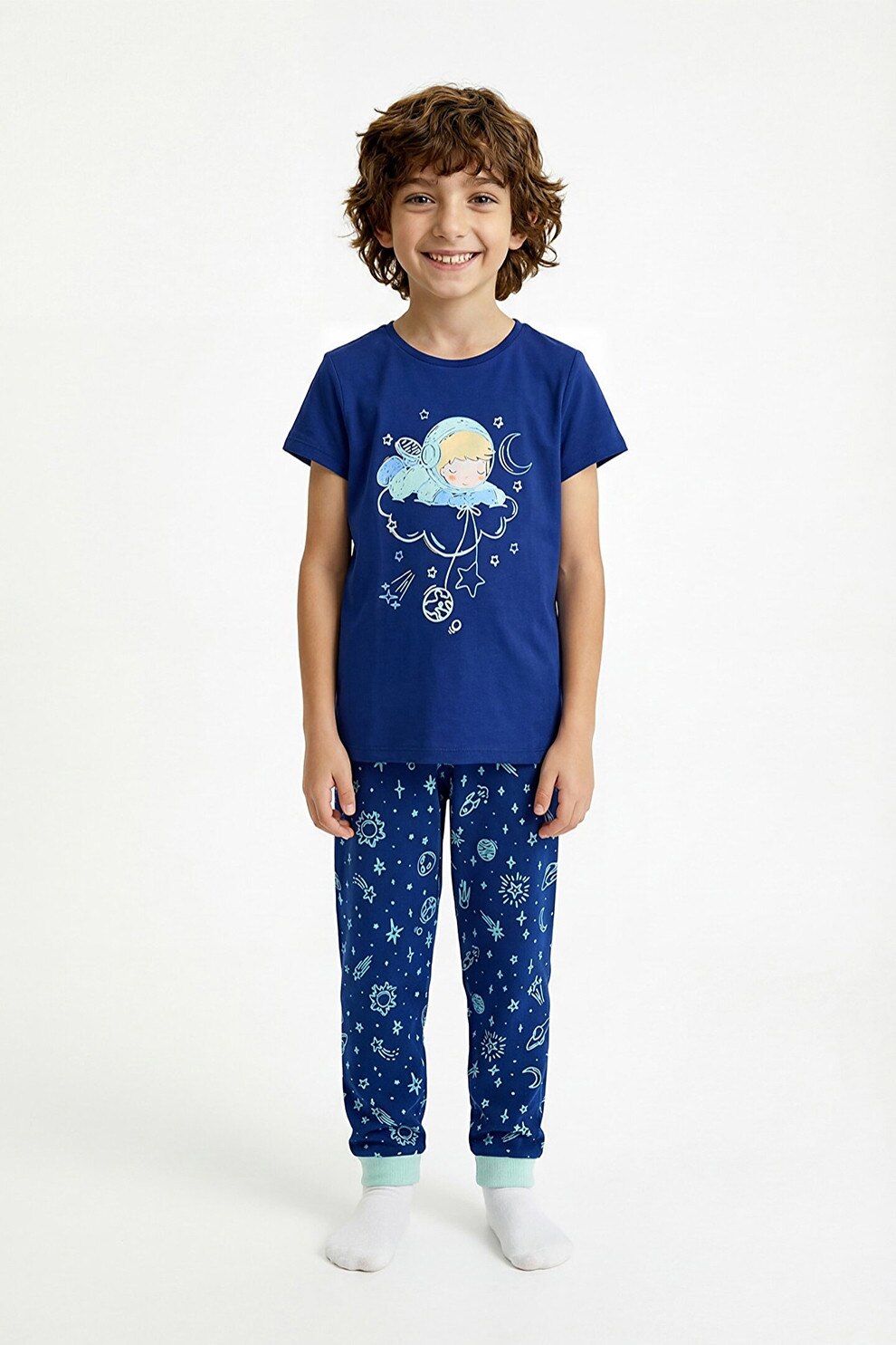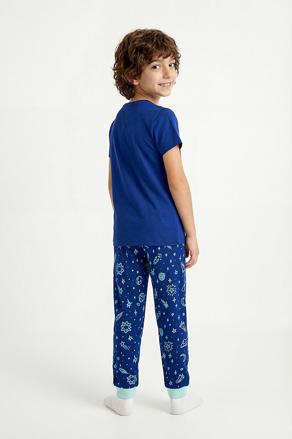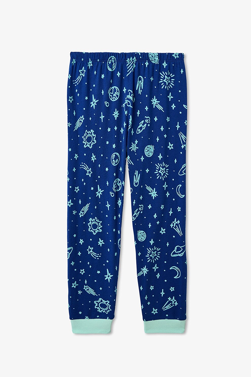Penti, Set de pijamale lungi cu imprimeu cosmic - 4 piese, Albastru inchis/Verde menta