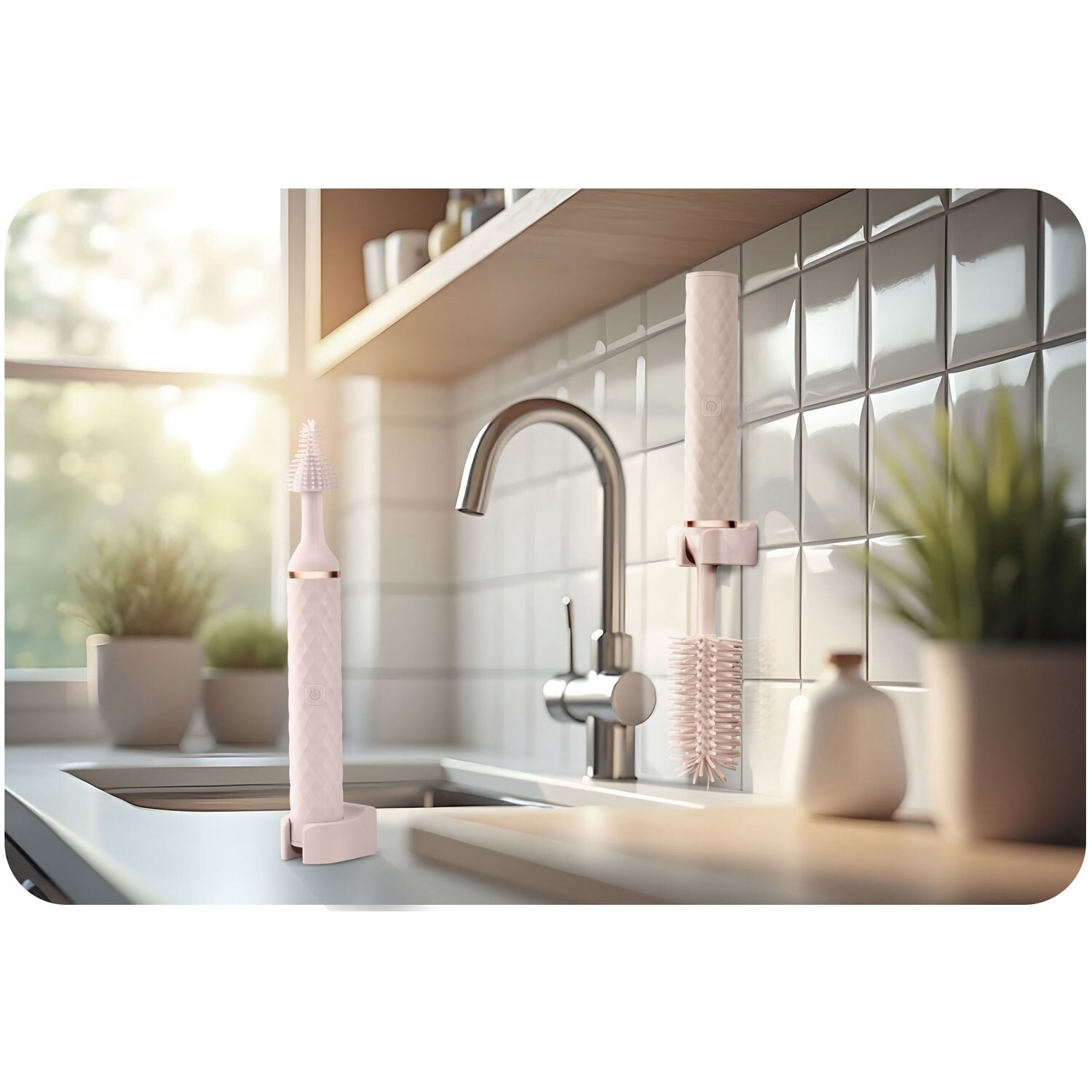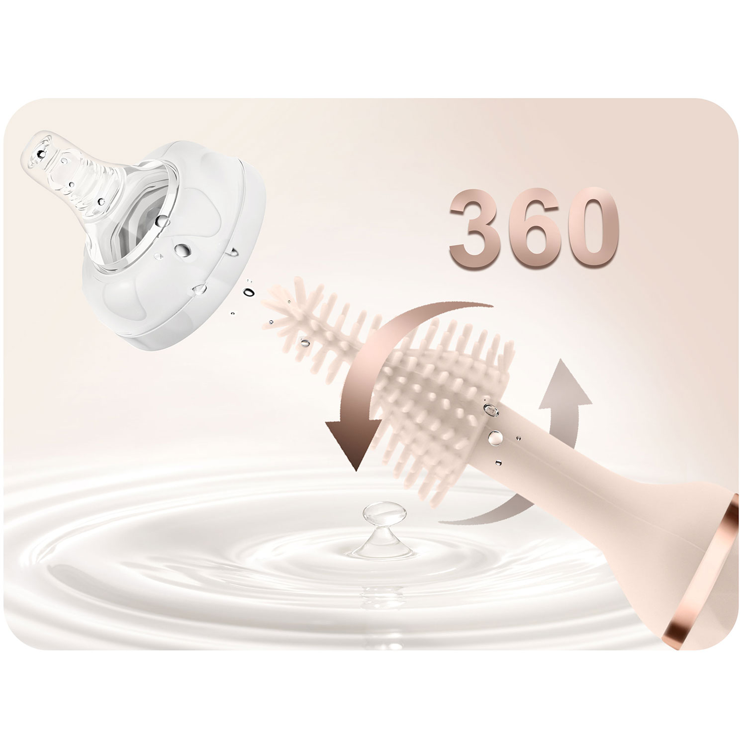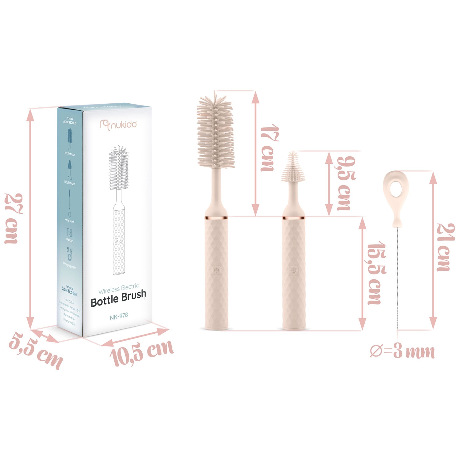 Perie electrica pentru spalat sticle Nukido - NICIODATA N-A FOST MAI USOR! Curatarea temeinica a biberoanelor este cruciala pentru sanatatea si siguranta copilului dumneavoastra. Se intampla uneori ca reziduurile uscate sa nu fie complet indepartate atunci cand sunt spalate manual sau in masina de spalat vase - aceasta problema dispare de acum inainte! O perie electrica va face spalarea pentru tine. Doua varfuri pivotante din silicon usor de inlocuit si o perie speciala pentru furtun va vor asigura igiena zilnica si va vor permite sa hraniti bebelusul cu alimente sanatoase si sigure. SIGURANTA COMPLETA – 0% BPA ✅ Periuta de dinti electrica Nukido pentru spalat biberoane si suzete nu contine Bisfenol A! BPA este un compus utilizat in productia de materiale plastice care are un impact negativ asupra organismului. Sugarii si copiii mici sunt expusi in mod deosebit la efectele toxice ale bisfenolului A, deoarece corpul lor nu poate elimina eficient toxinele din organism. Peria noastra nu contine acest compus! Avand grija de sanatatea micutilor tai, am depus toate eforturile pentru a ne asigura ca toate elementele sunt complet sigure si nu deterioreaza vasele care sunt spalate. Cream doar produse care satisfac asteptarile celor mai pretentioase mamici. VITEZA SI PRECIZITATE Varfurile de curatare rotative isi vor face treaba mult mai precis si mult mai rapid decat am fi capabili sa o facem noi insine. Structura lor special conceputa, adaptata pentru a indeparta toate reziduurile de pe elemente de diferite forme si dimensiuni, va ajunge chiar si in cele mai adanci colturi si va asigura ca suprafata lor este intotdeauna perfect curata. Veti putea folosi din nou vasul curatat cu aceeasi constiinta curata si cu aceeasi siguranta de siguranta. UTILITATE UNIVERSALA Mai mult, peria va fi utila si pentru curatarea altor vase - precum cani, sticle de apa sau termosuri, al caror interior este uneori dificil de curatat temeinic prin metode traditionale. Utilitatea periei nu se termina atunci cand copilul creste din baut din sticla. Odata achizitionata, o perie poate fi folosita ani de zile, usurand activitatile zilnice din bucatarie. Acesta este un ajutor de nepretuit pentru toti membrii gospodariei si ii va scuti de efort obositor. ELEGANTA TEHNICA Peria electrica Nukido este proiectata elegant cu materiale rezistente. Dispozitivul are un maner confortabil, este desigur rezistent la apa si este controlat intuitiv - un buton cu un indicator LED care indica functionarea regulata, starea de incarcare si, de asemenea, avertizeaza despre tensiunea scazuta. Varfuri diversificate Varfurile rotative din silicon sunt concepute astfel incat perii lor sa poata curata orice forma de vas fara a-i deteriora suprafata, dar si in asa fel incat sa poata fi spalate cu usurinta. Forma lor si materialul din care sunt fabricate au fost alese pentru a se asigura ca nu se acumuleaza reziduuri sau bacterii pe ele. Libertate wireless Bateria de 1200 mAh ofera periei un timp de functionare de pana la 3 ore la o singura incarcare folosind un incarcator USB-C. Pentru a economisi energie, dispozitivul se opreste automat dupa 30 de minute. PARTELE PERIEI POT FI SPALATE IN MASINA DE SPALAT VASE (cu exceptia tabloului electric)! Materialele din care sunt realizate capetele de perie au proprietati antibacteriene si sunt usor de curatat. CONTINUT SET: varf de biberon, varf de suzeta, varf de furtun, cablu USB-C, pandantiv