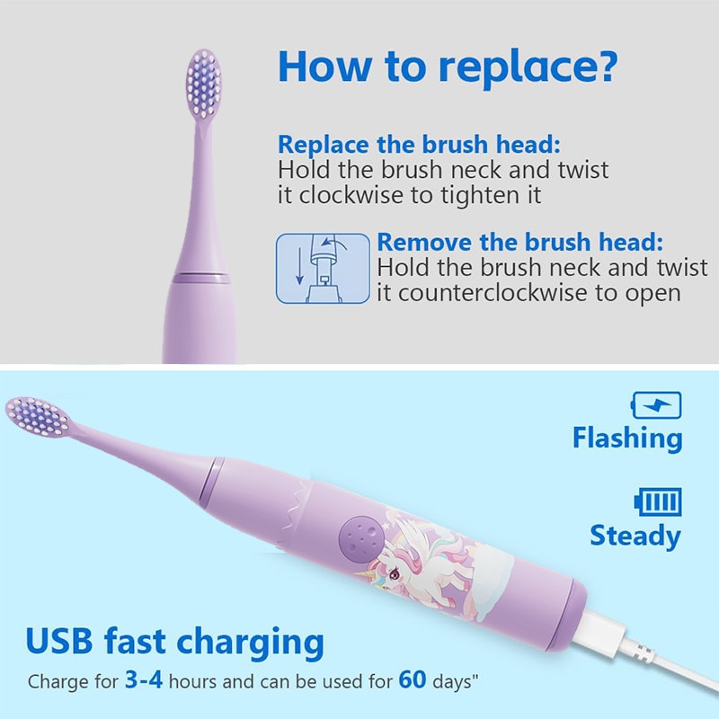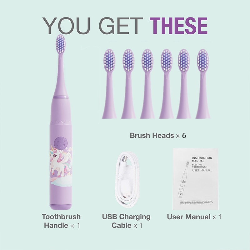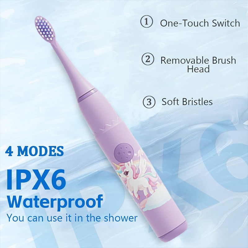 Periuță de dinți electrică Chelfonds pentru copii, 4 moduri, 6 capete de schimb, tematică unicorn