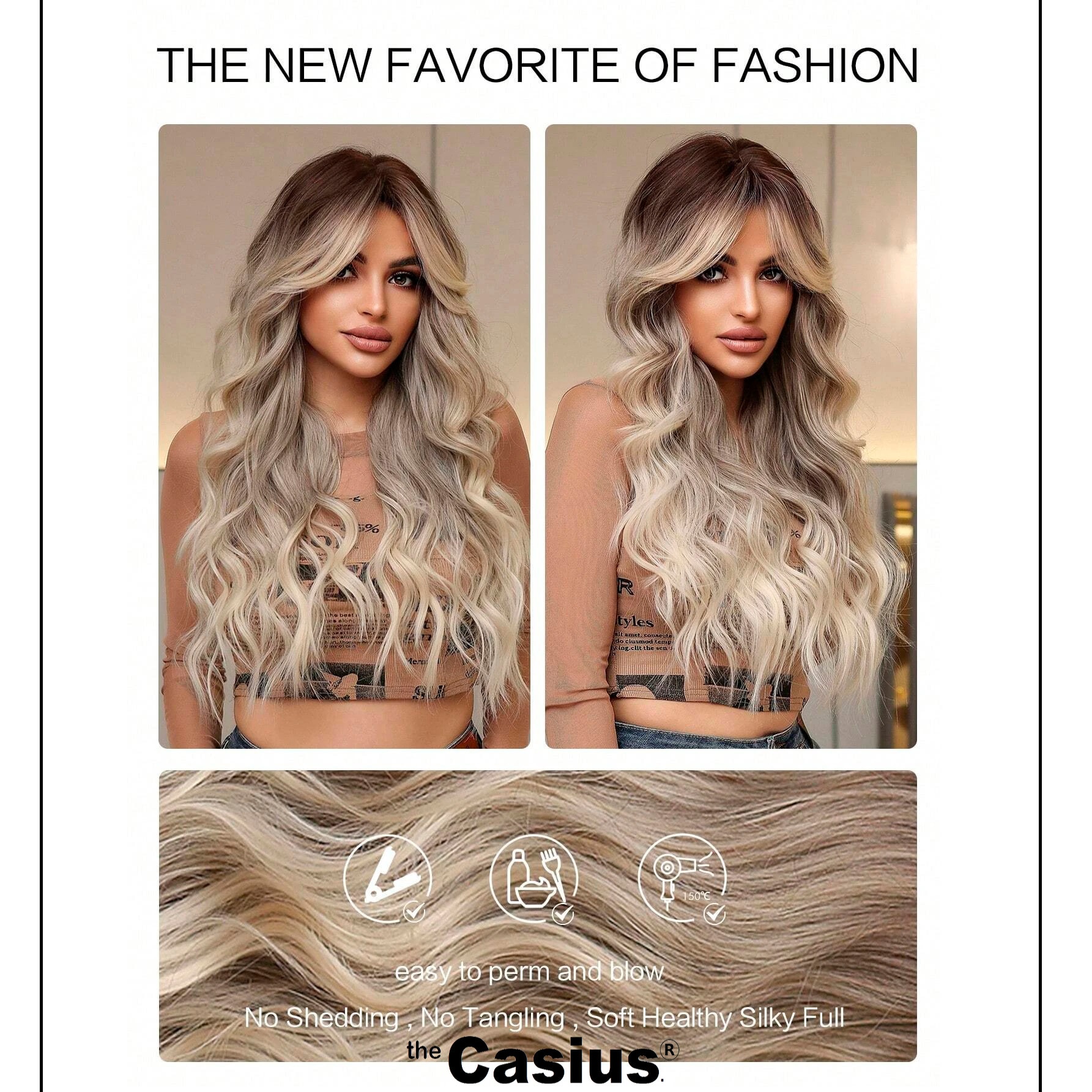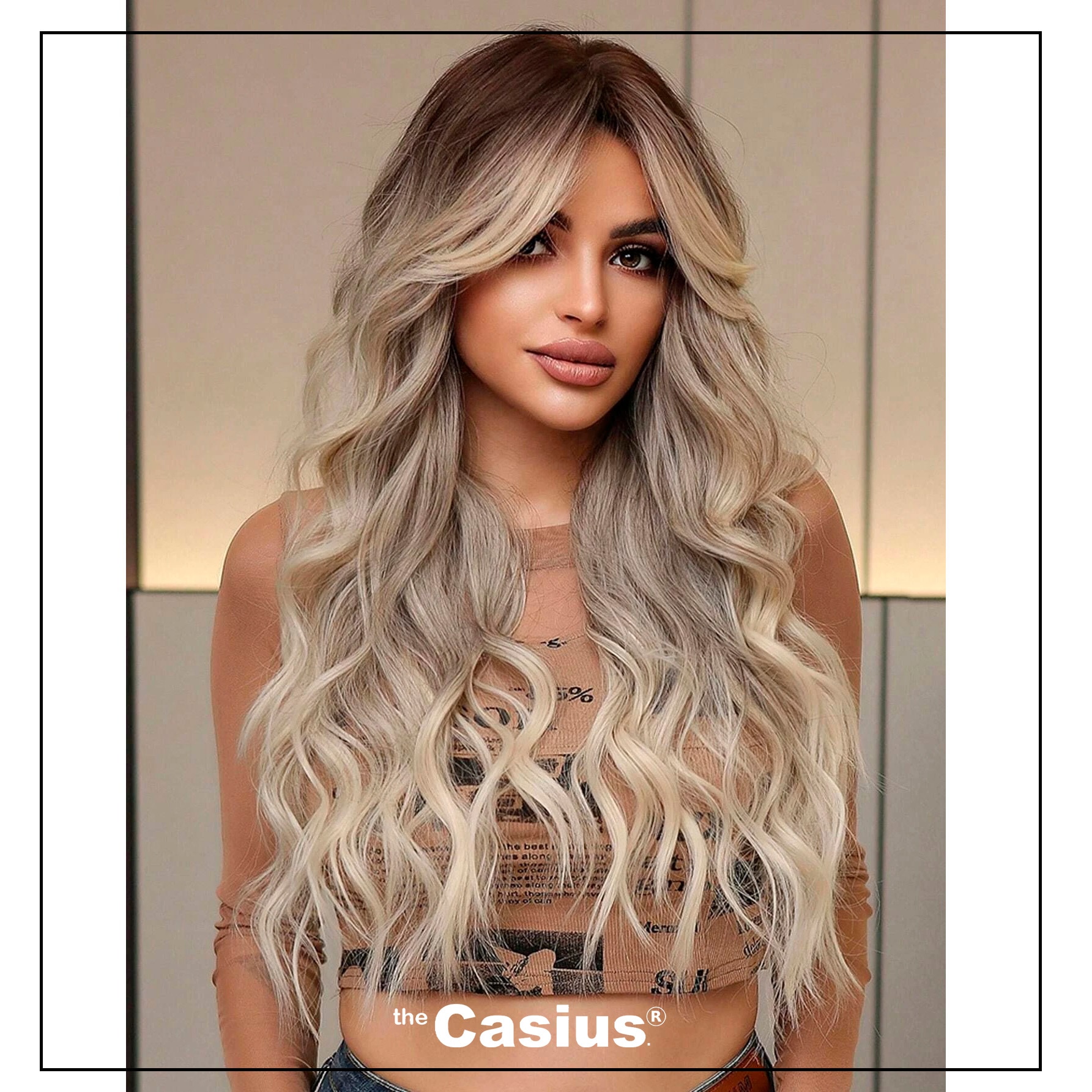The Casius. - Peruca pentru femei cu par lung ondulat, breton, culoarea blond cenusiu balayage, 65 cm, The Casius