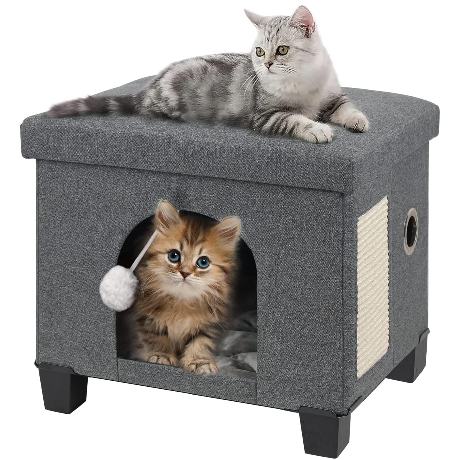 Pestera pentru pisici Brian & Dany, 45x37.5x38cm, gri închis, cu zonă de zgariat și minge de joacă
