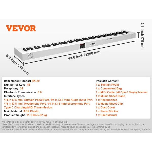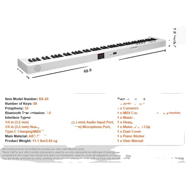 Pian electronic portabil, 88 clape, alb, set cu pedala de sustinere, cablu MIDI, suport pentru partituri, casti, husa de transport