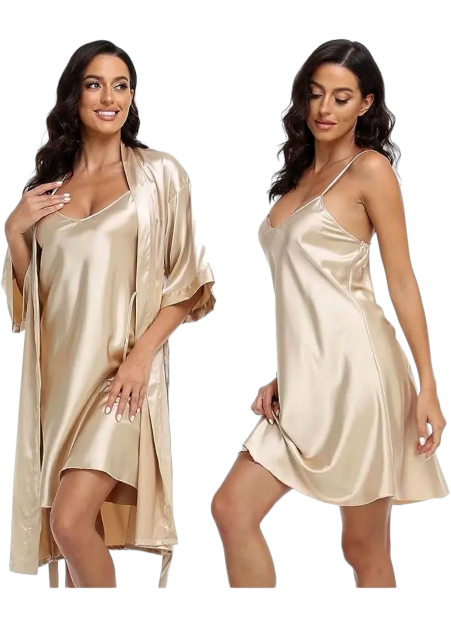 Pijama dama satin, StarFashion, 2 piese, Bej