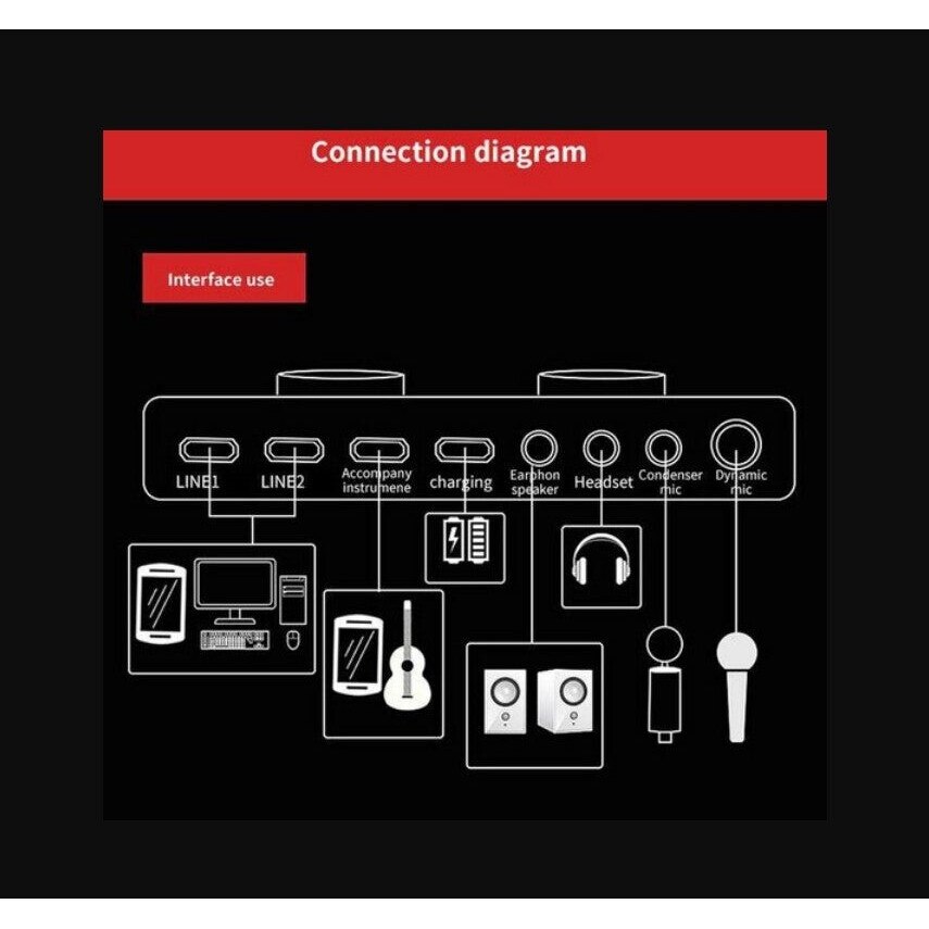 Butoane de control pentru volumul microfonului, volumul ecourilor, inalte, bas, volumul inregistrarii, volumul muzicii si reglarea volumului monitorului - mufele USB LIVE1, LIVE2 si Accompany pentru instrument; Mufe de iesire pentru difuzoare si casti de 3,5 mm Microfoane cu condensator de 3,5 mm si mufe de intrare dinamice pentru microfon de 6,35 mm
