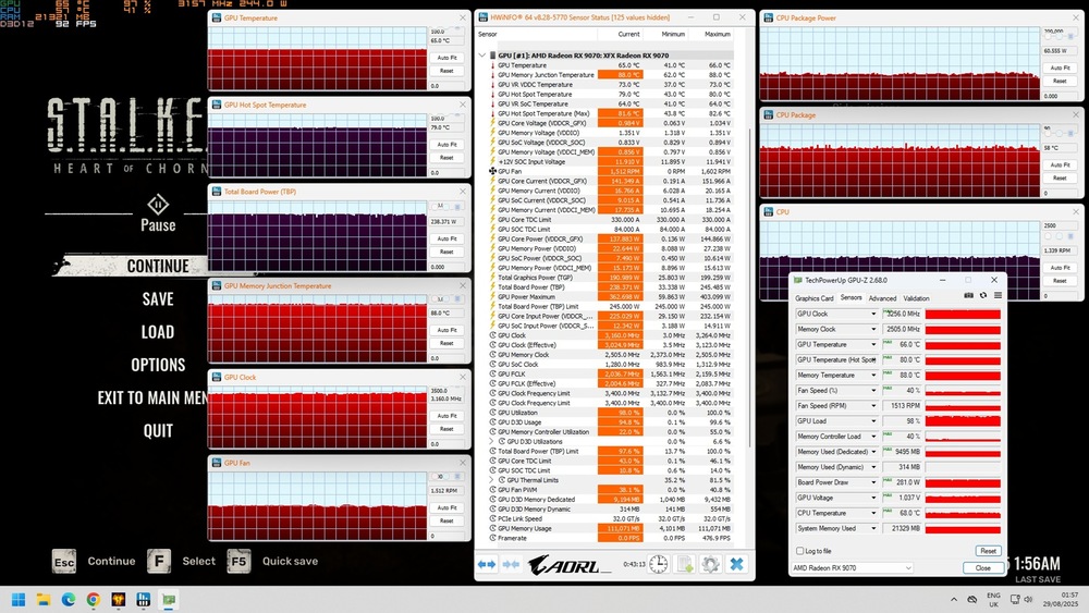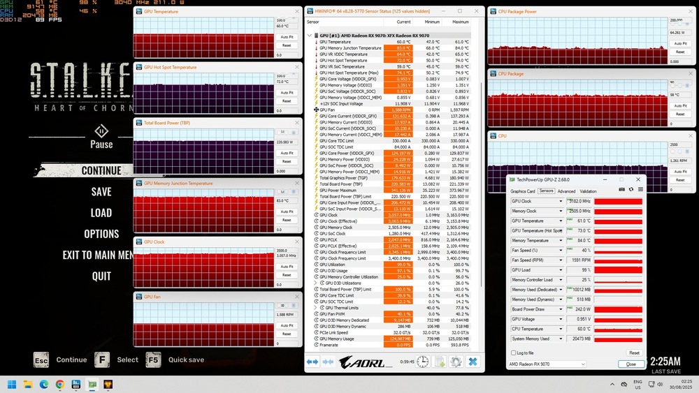 Pun 2 poze in care se pot vedea si temperaturile ( luati in considerare ca sunt facute la 26 de grade in casa, nu la 21-22 cum sunt facute review-rile de pe net ). In poza cu temperaturile mai mari singura modificare e -60mV facuta din Adrenalin. La cea cu temperaturile mai mici am mai scazut si 10% Power, tot din Adrenalin. Am lasat-o la -10% Power pentru ca temperaturile scad binisor dar FPS-urile doar de la 92 la 89 in STALKER 2, probabil pentru ca si frecventa scade tot cam cu 3%.