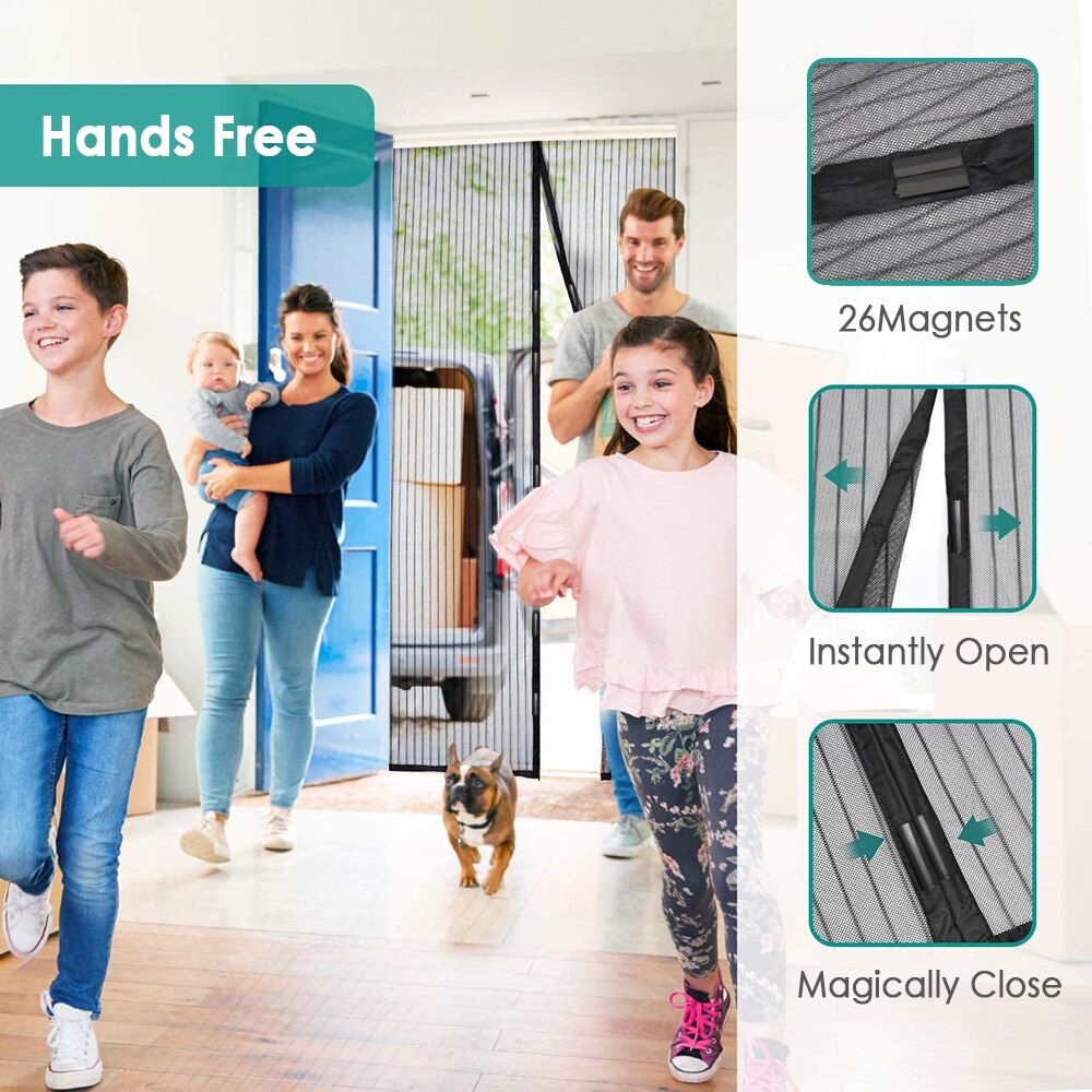 Deschideti si inchideti ca prin magie: Plasa este echipata cu 18 magneti incorporati pentru a asigura o etansare rapida si are tije gravitationale. Umpluta cu puncte magnetice ascunse puternice si cusute in marginile intarite, deschideti si inchideti automat fara a ramane spatii. Este, de asemnea, silentioasa. Copiii si cainii pot intra si iesi oricand. Pastrati-va familia departe de insecte. Plasa permite intrarea aerului proaspat si a luminii naturale;