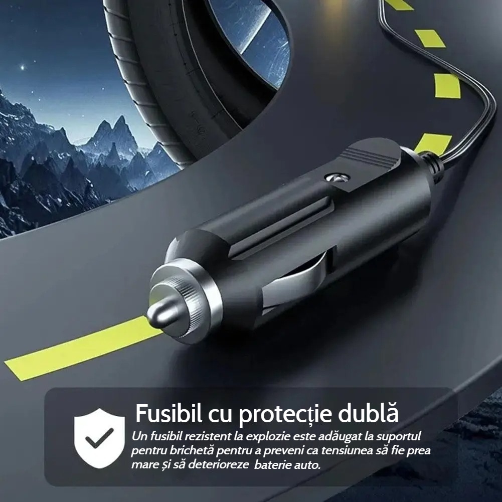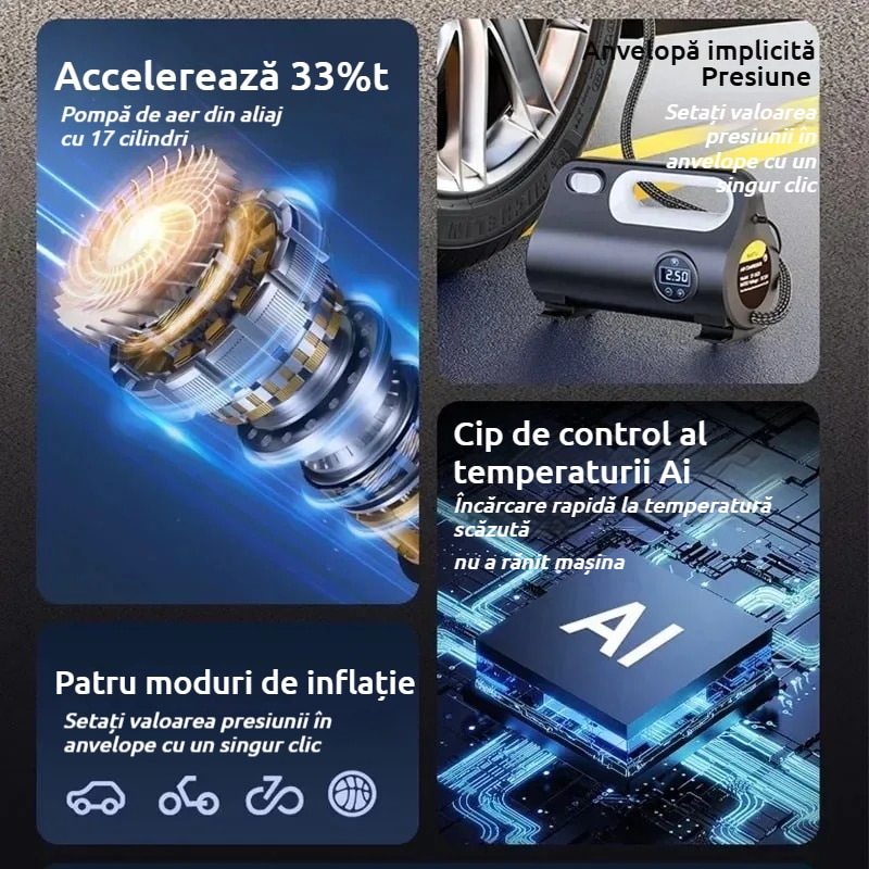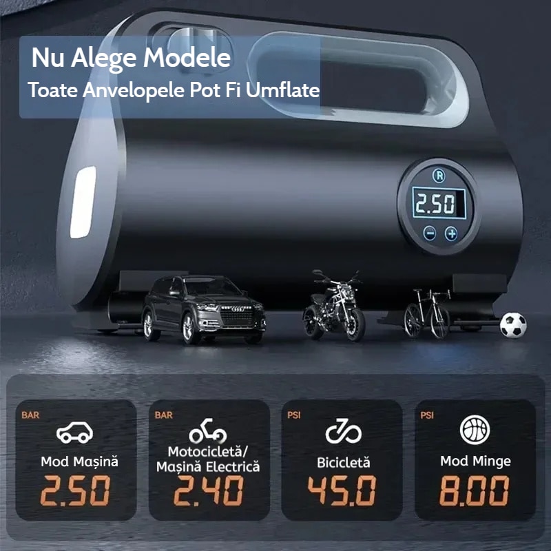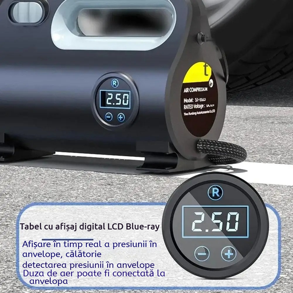 Conducere autonoma pe distante lungi: in timpul calatoriilor cu auto-conducere pe distante lungi, o pompa de aer pentru masina este indispensabila. Cand presiunea in anvelope este insuficienta, aceasta poate fi completata in timp. Presiunea prestabilita a anvelopei si functia de oprire automata asigura siguranta de conducere Parcarea pe timp de noapte Cadranul de afisare digitala poate verifica in orice moment starea de umflare.