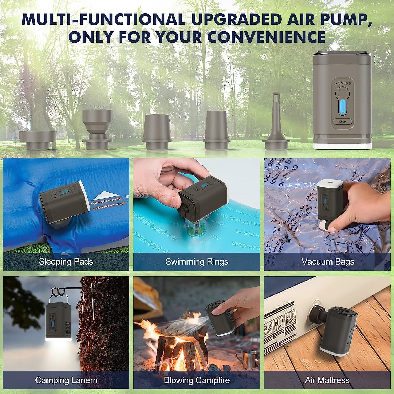 Pompa de aer electrica, Bedee, Usor si portabil, pentru umflat/dezumflat saltele, Lanterna LED, Reincarcabil USB, Multifunctionala, cu 5 duze, potrivit pentru pomparea/desumflarea piscinelor, barcilor cu vasle, campingurilor si colacelor de inot, Negru