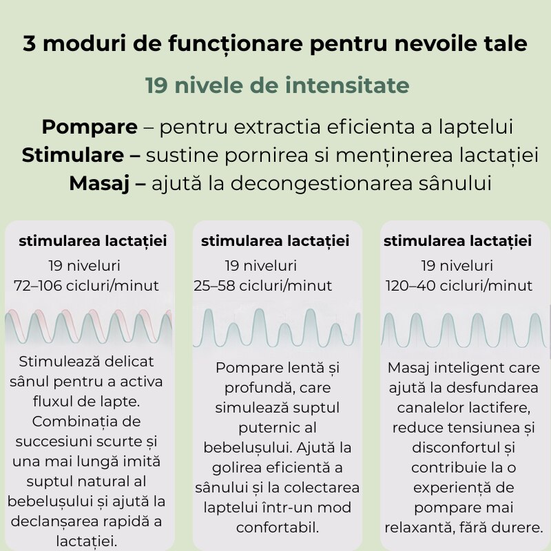 Unul dintre cele mai mari avantaje ale pompei de san electrice Kidizi 103 este numarul ridicat de 19 niveluri de intensitate pentru fiecare mod de functionare. Acest lucru permite un control extrem de precis asupra pomparii, astfel incat fiecare mamica sa poata gasi nivelul optim intre eficienta si confort, indiferent de sensibilitatea sanului sau de etapa lactatiei.
