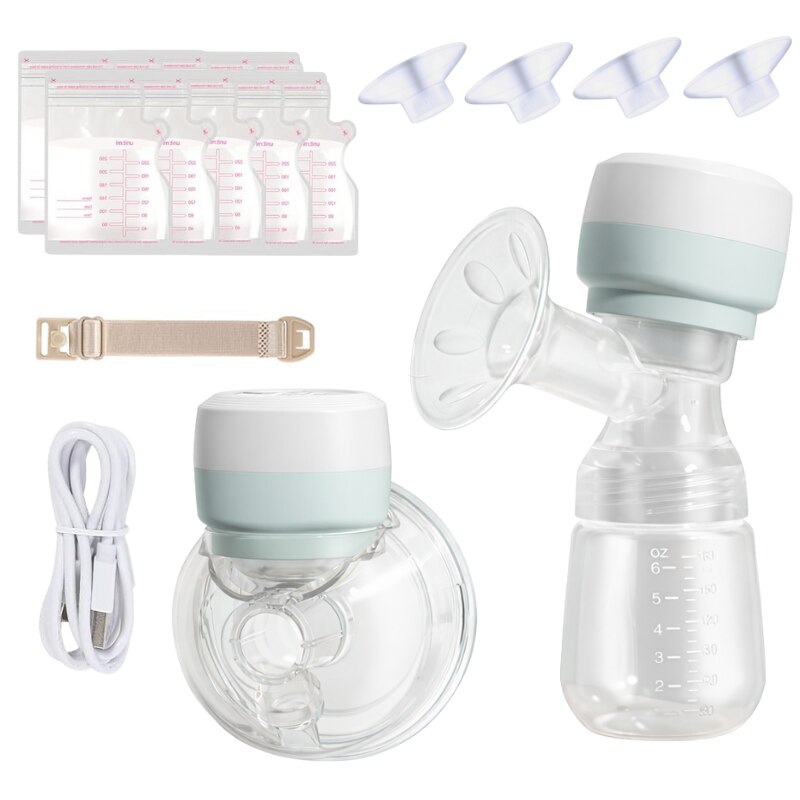 - Continut pachet – motor pompa, diafragme din silicon, conectori, valve, biberon pentru hranire, recipient colectare lapte, falanga standard 24 mm, inserturi silicon 16–22 mm, dop din silicon, cablu USB, catarama de ajustare, set tetina, 10 pungi pentru stocarea laptelui, manual de utilizare