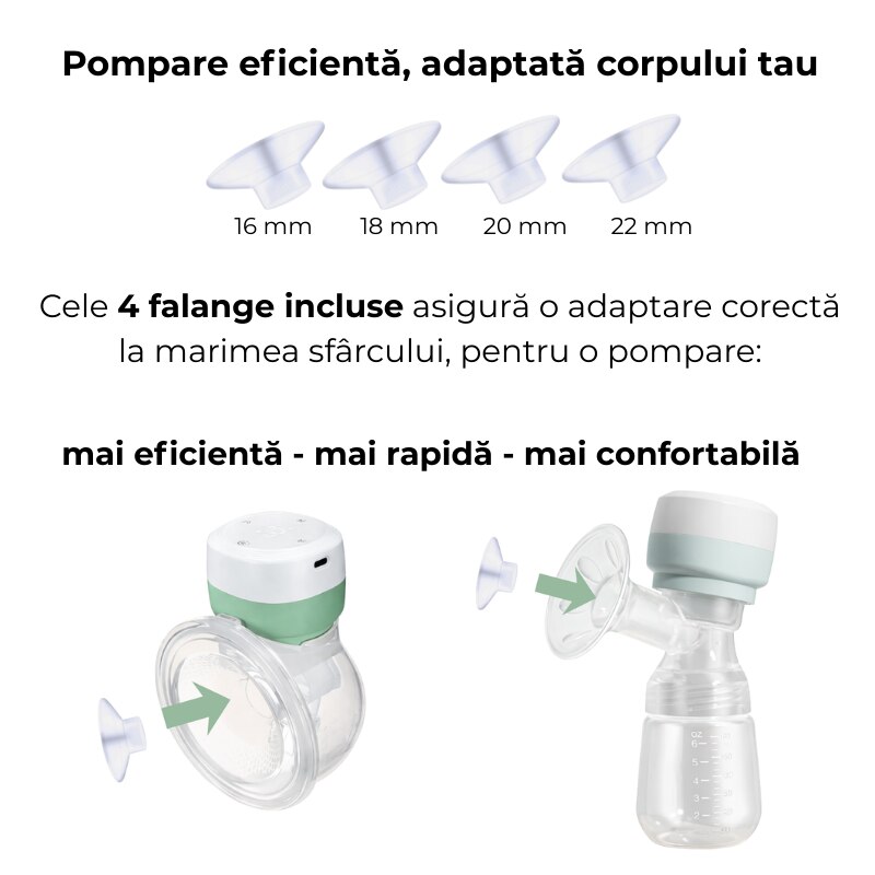 Un avantaj esential al acestui model este adaptabilitatea completa la dimensiunea mamelonului. Pompa este echipata cu falanga standard de 24 mm, iar in pachet sunt incluse inserturi interschimbabile de 16, 18, 20 si 22 mm. Astfel, pompa poate fi folosita confortabil de mame cu dimensiuni ale mamelonului cuprinse intre 16 si 24 mm, fara a fi nevoie de accesorii suplimentare.