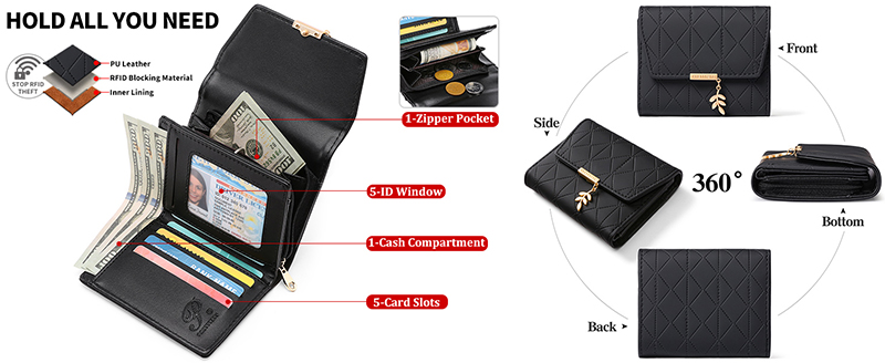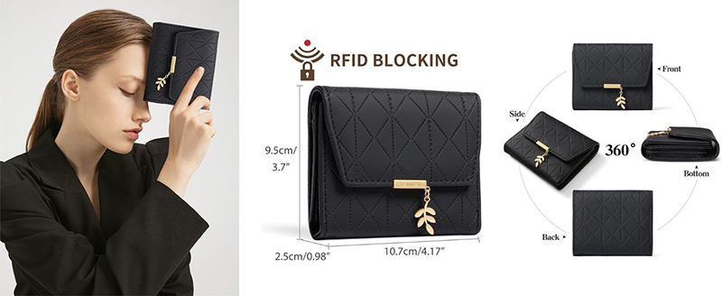 Portofel dama, BOMSTOM, design compact, protectie RFID, negru, 10.7x9.5x2.5cm