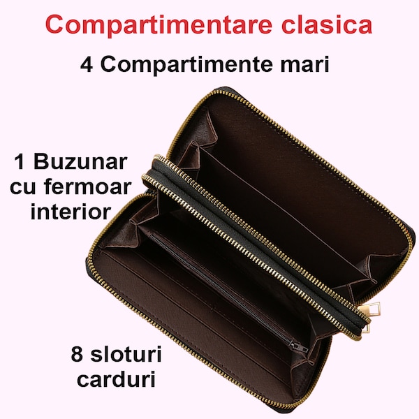 | Detalii | 2 compartimente mari cu fermoar 2 Compartiment pentru bancnote 1 compartiment interior pentru documente / carte de identitate portmoneu 8 sloturi pentru card 1 compartiment cu fermoar in interior 1 Compartiment pentru telefonul mobil |