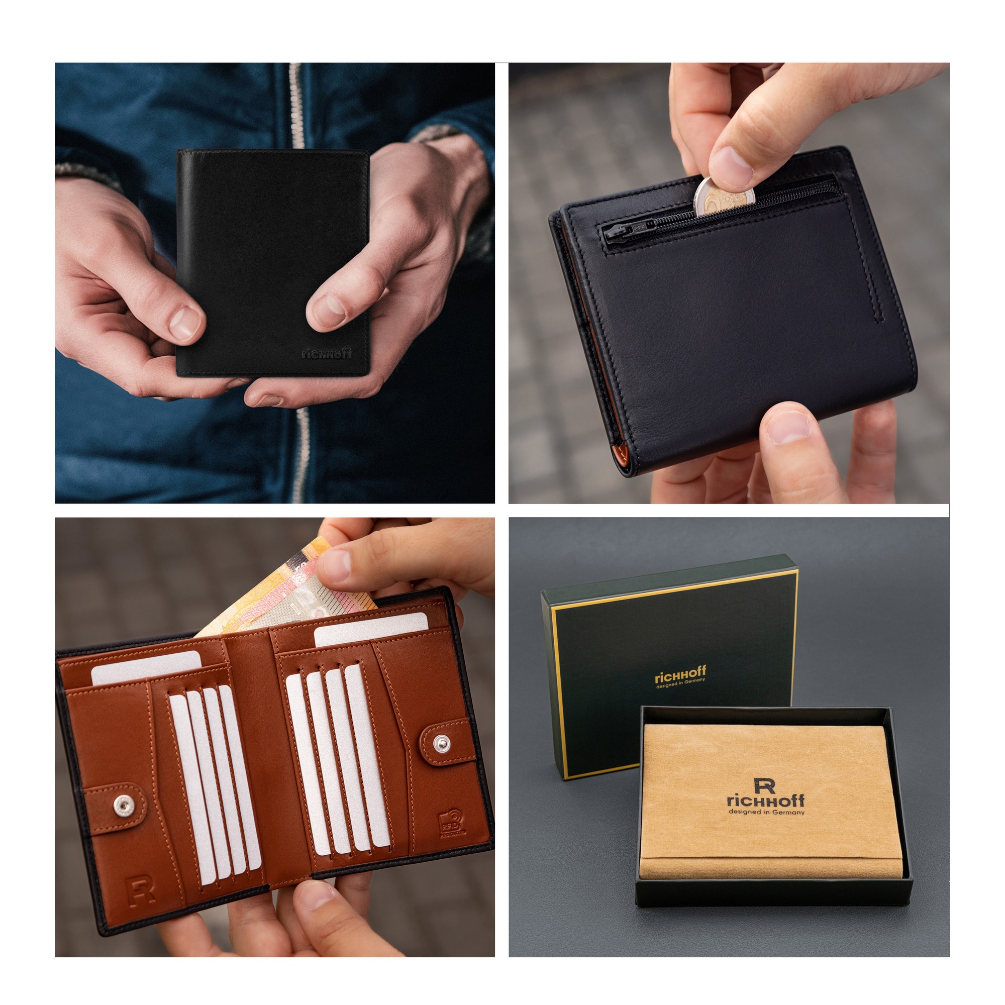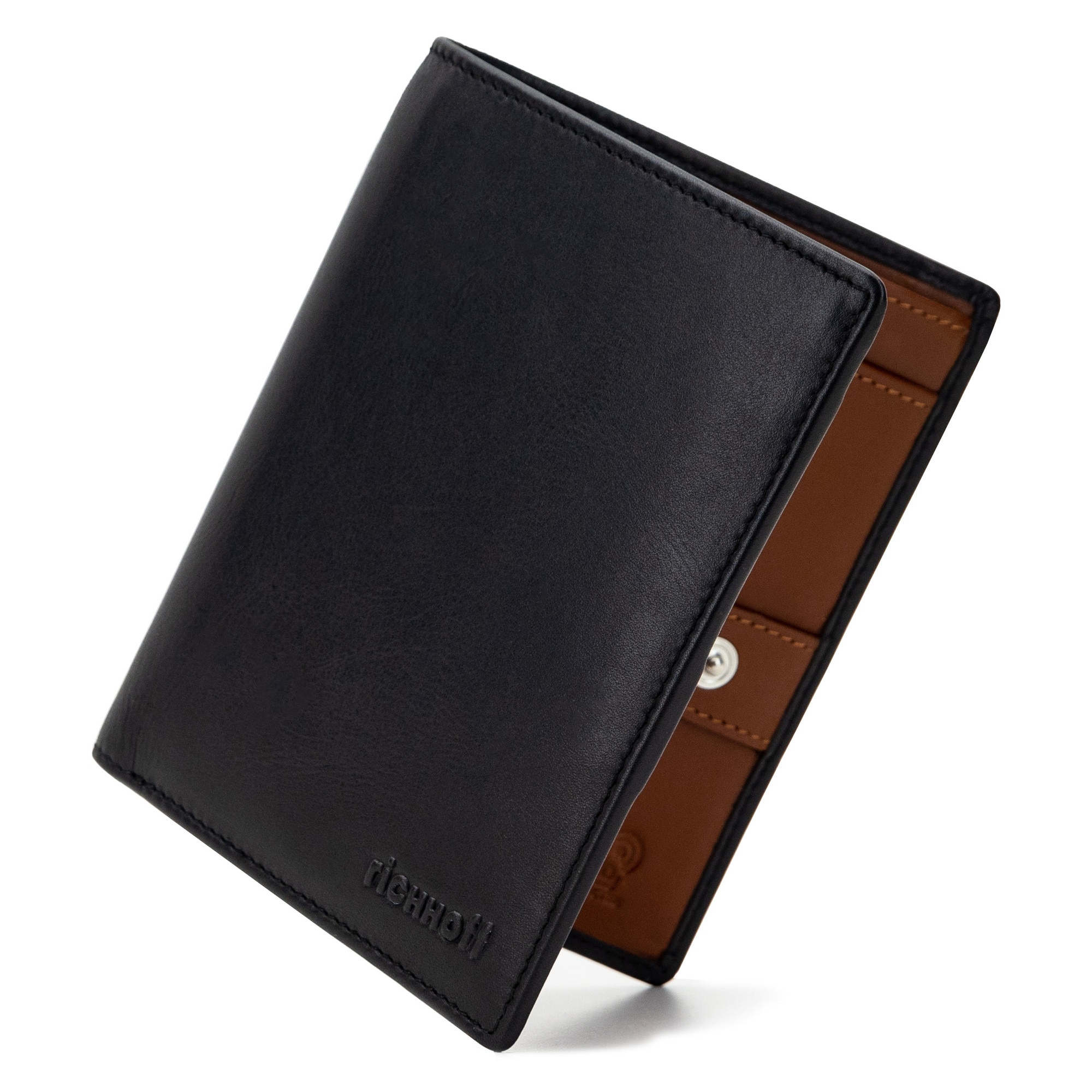 Richhoff - Portofel modern slim vertical barbati, protectie RFID, piele naturala premium, compartimente pentru CI si talon auto, ambalat in cutie cadou, culoare negru/cognac