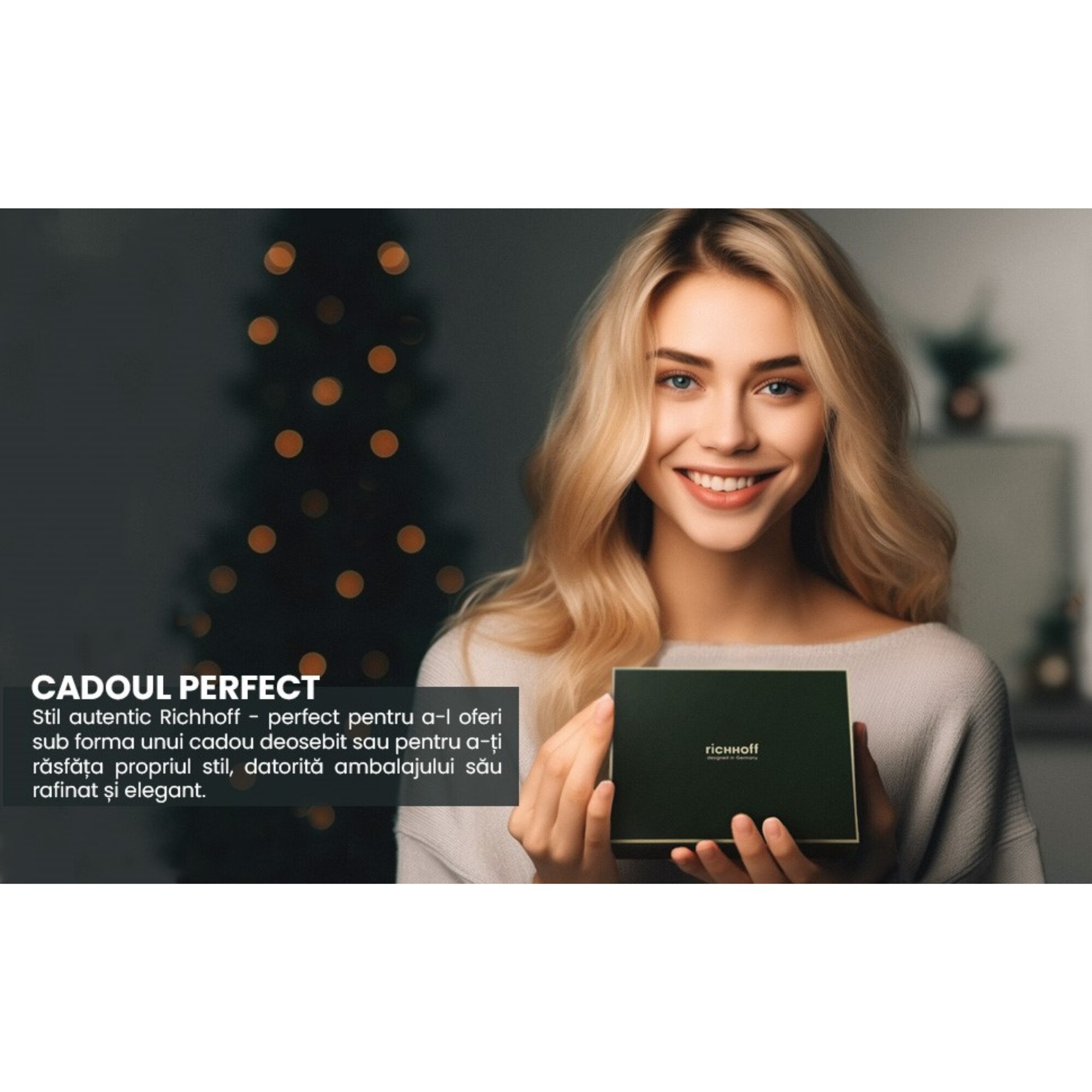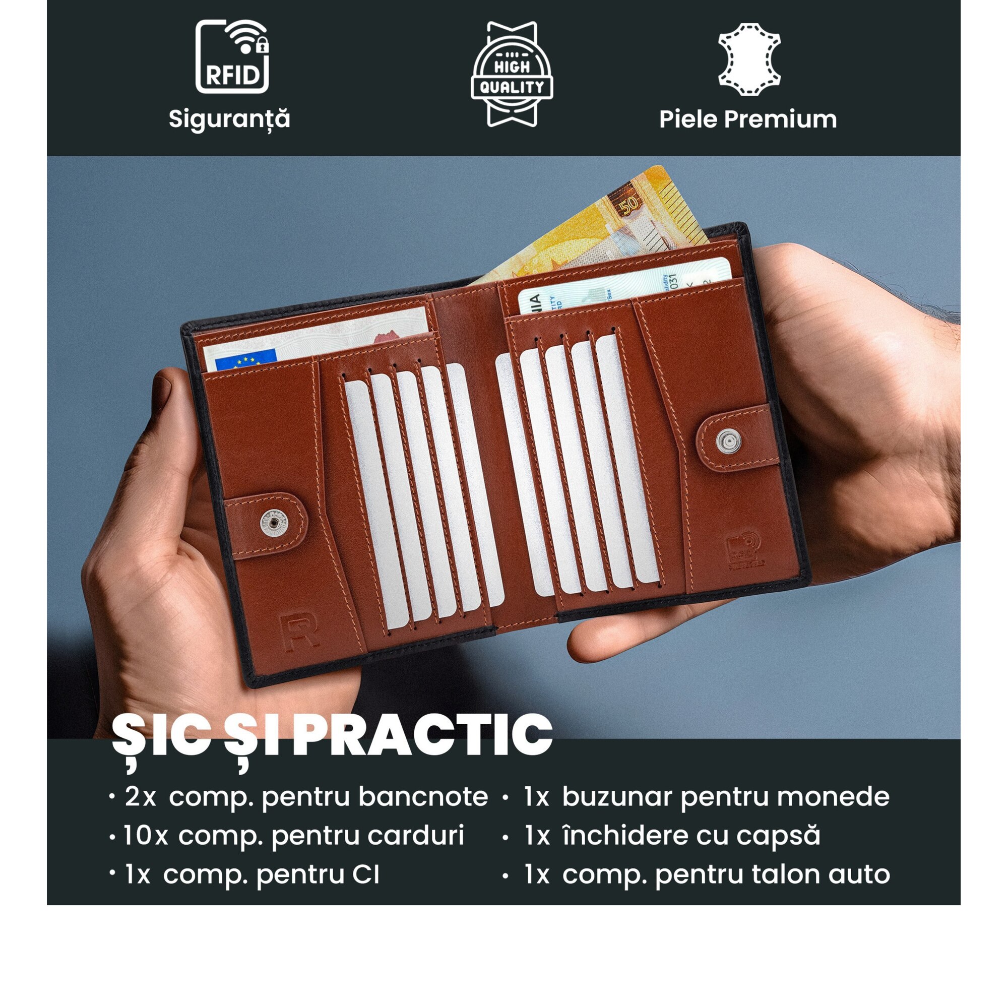 Portofel modern slim vertical barbati, Richhoff, protectie RFID, piele naturala premium, compartimente pentru CI si talon auto, ambalat in cutie cadou, culoare negru/cognac