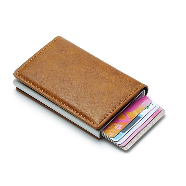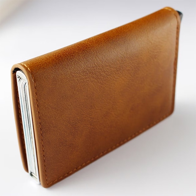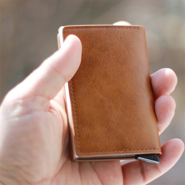 Portofel securizat RFID pentru carduri, PortCard cu glisare rapida pop-up, piele ecologica, Ultra Slim, unisex, compartiment bancnote, maro deschis