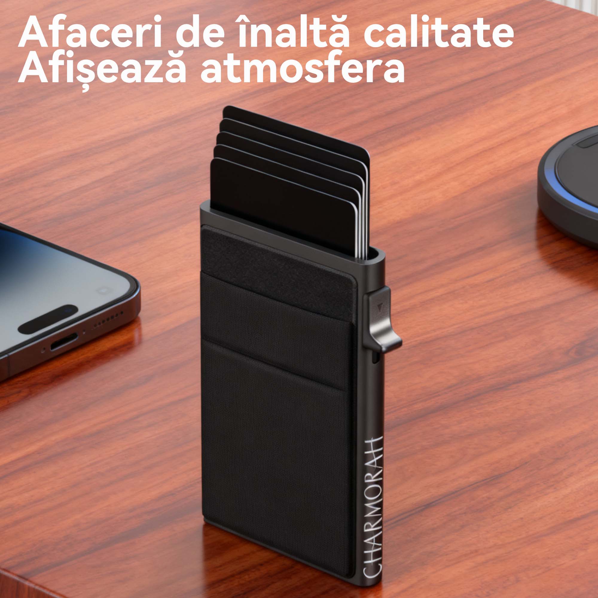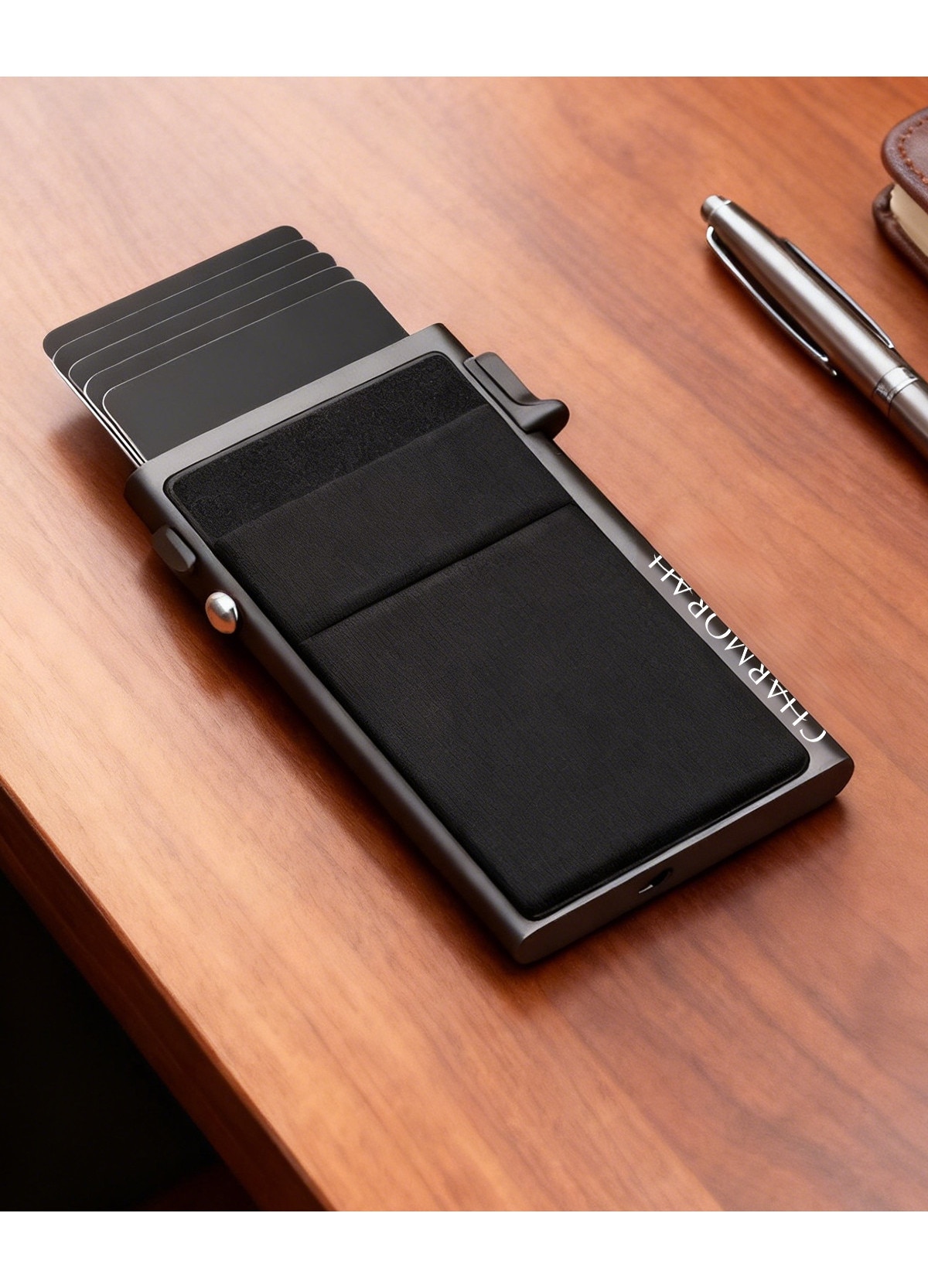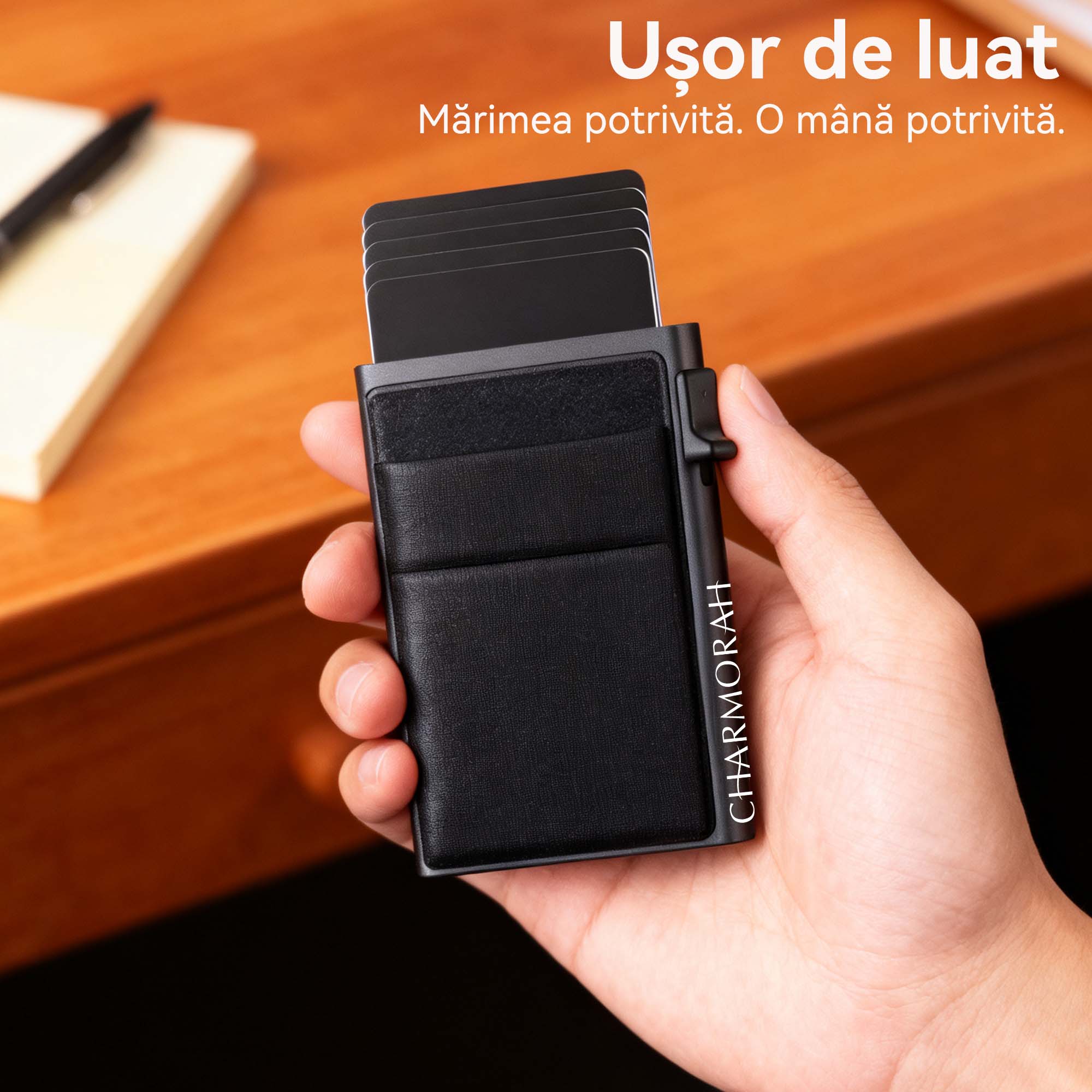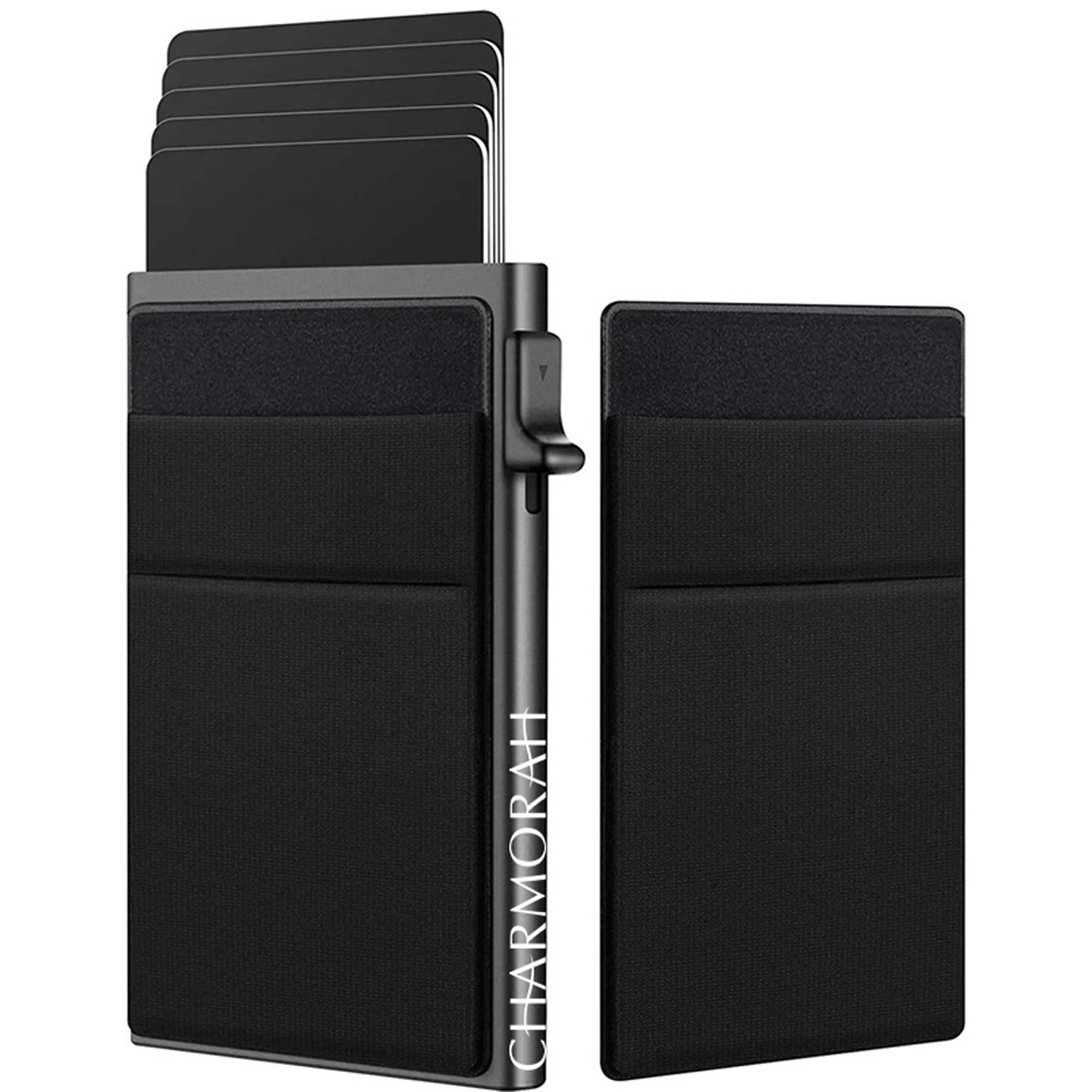 Charmorah - Portofel subtire din aluminiu pentru carduri, Suport de card pop-up, Negru