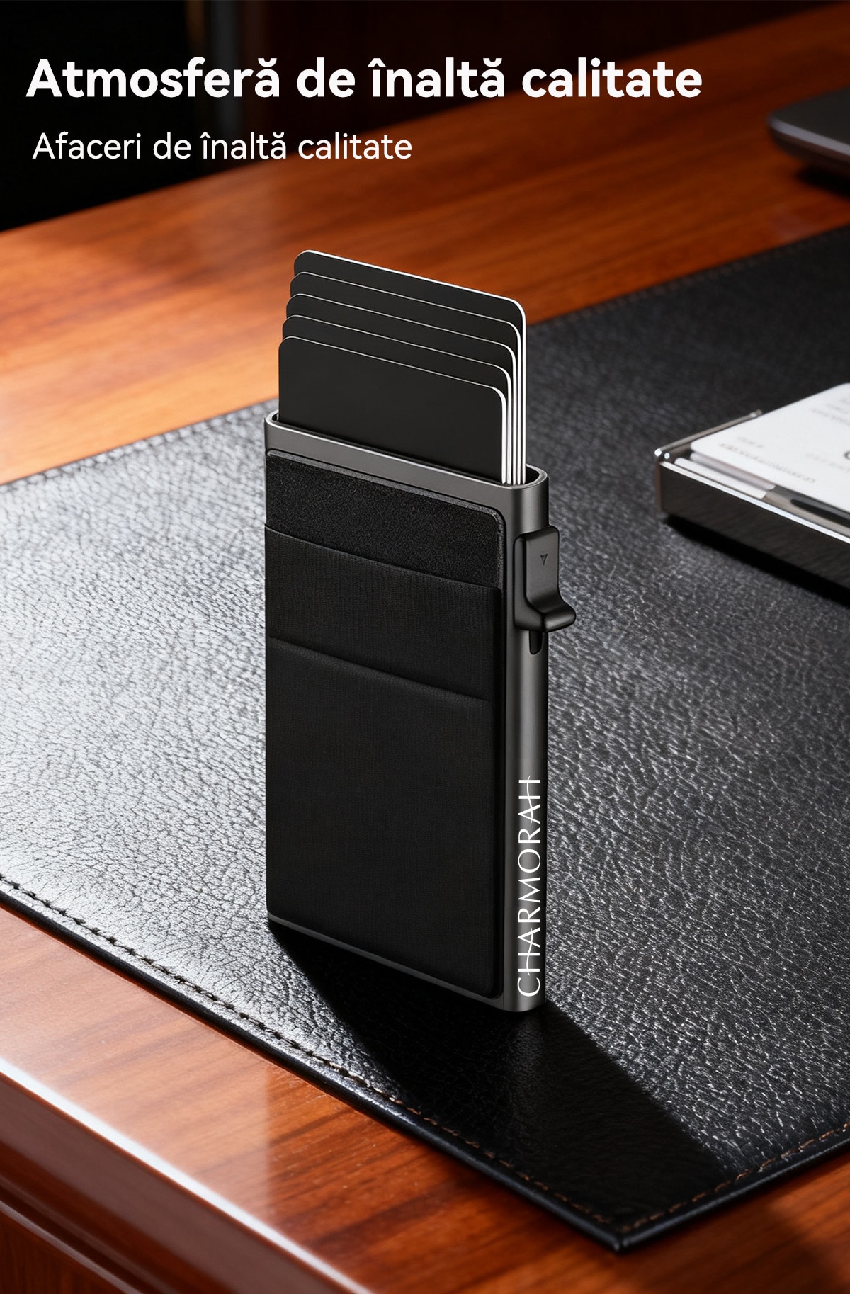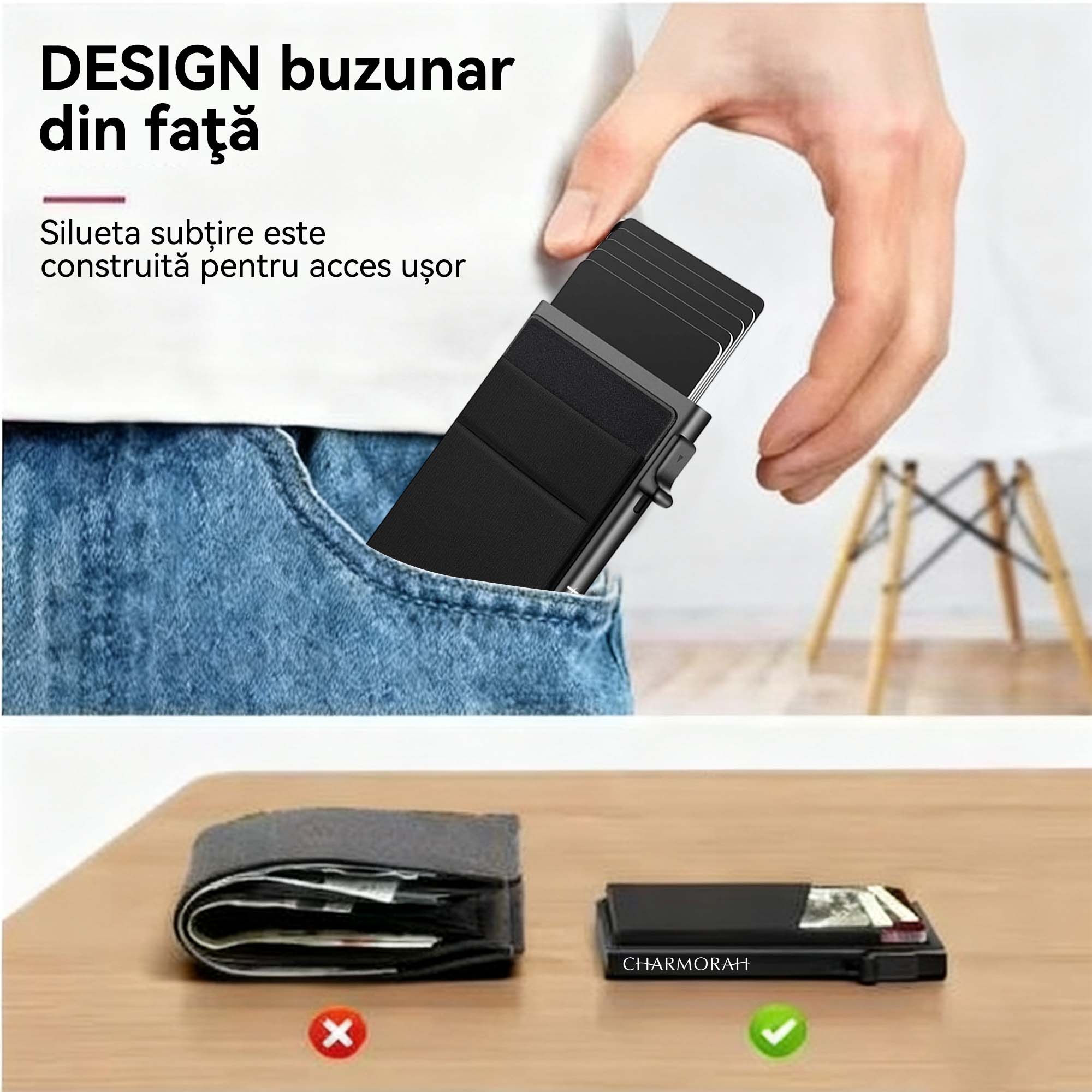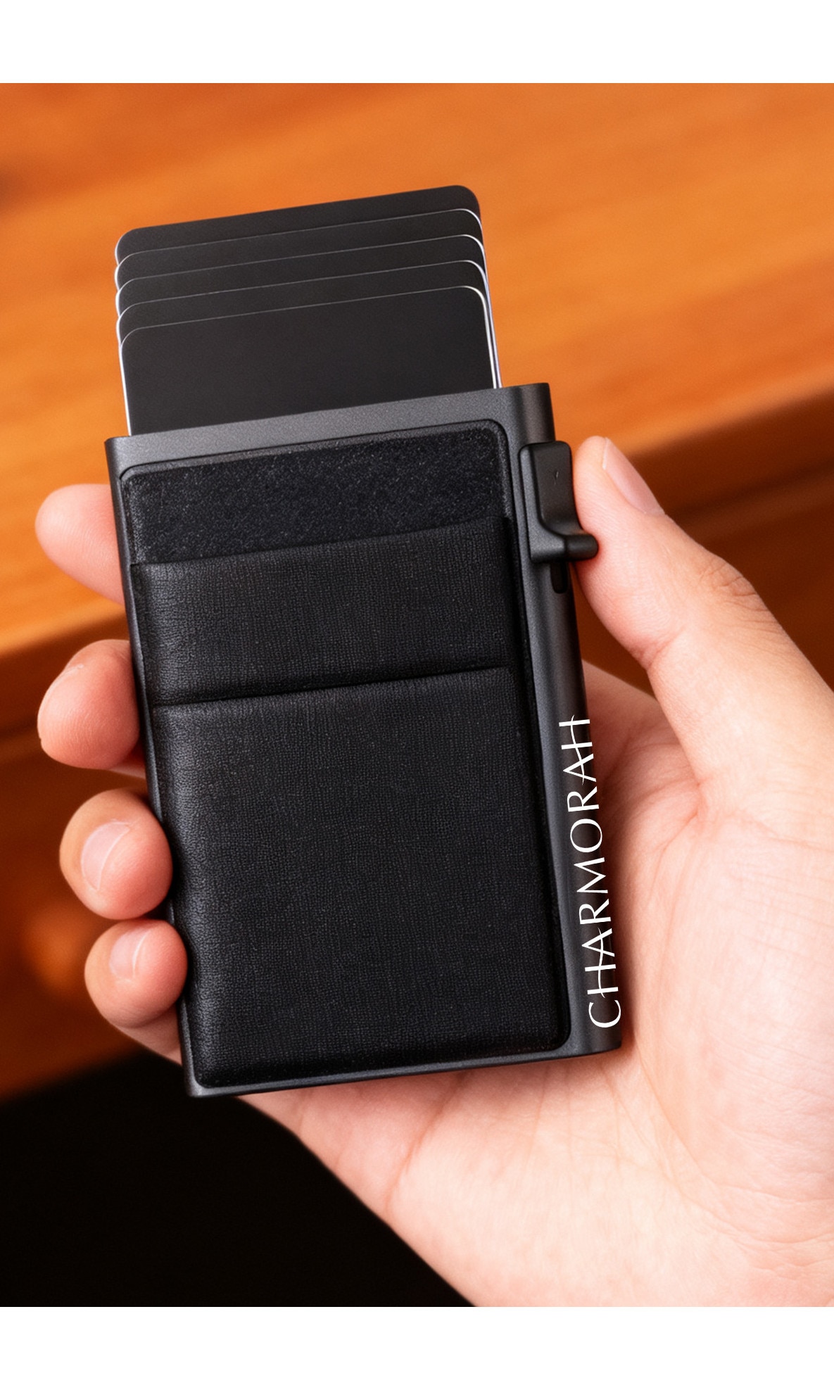Charmorah - Portofel subtire din aluminiu pentru carduri, Suport de card pop-up, Negru