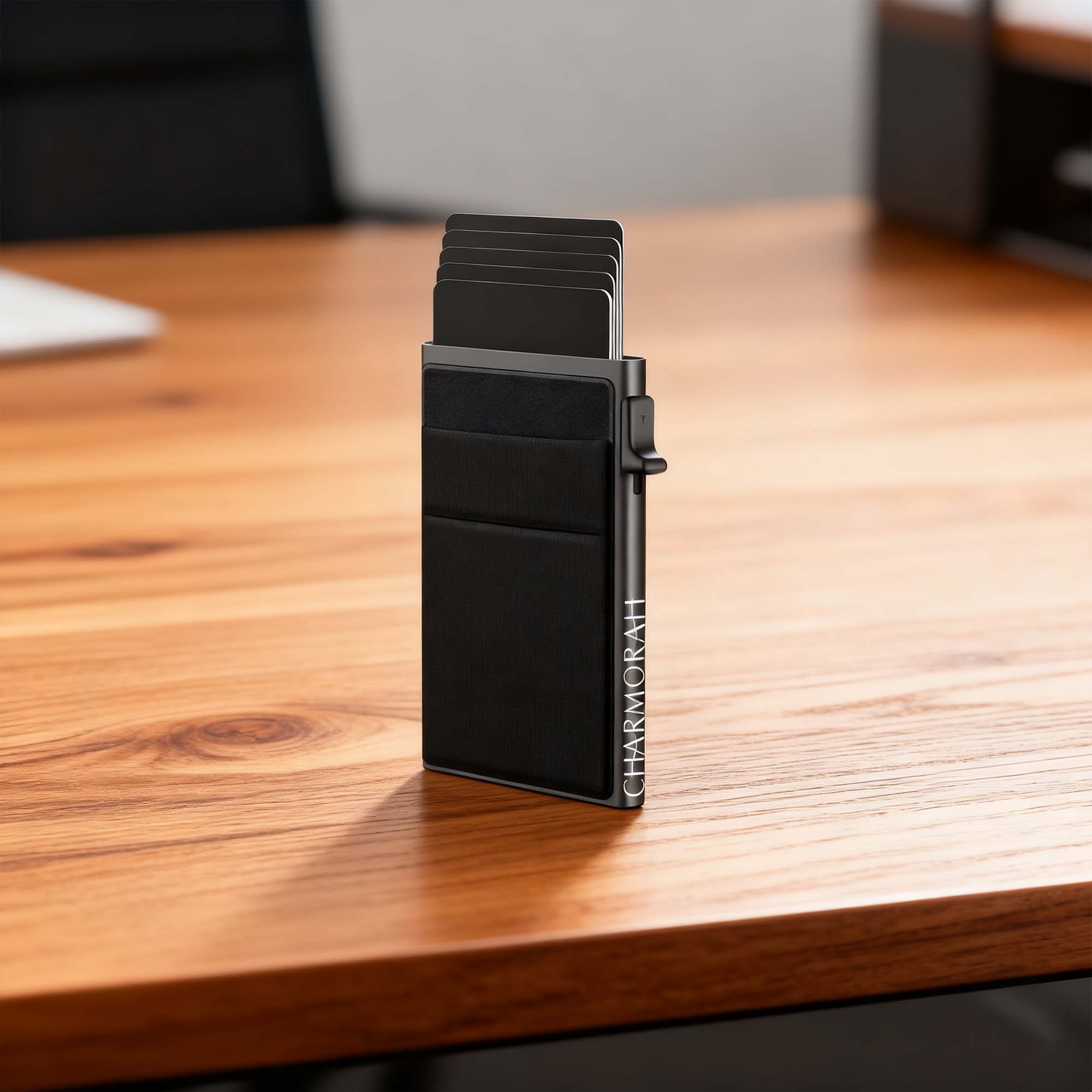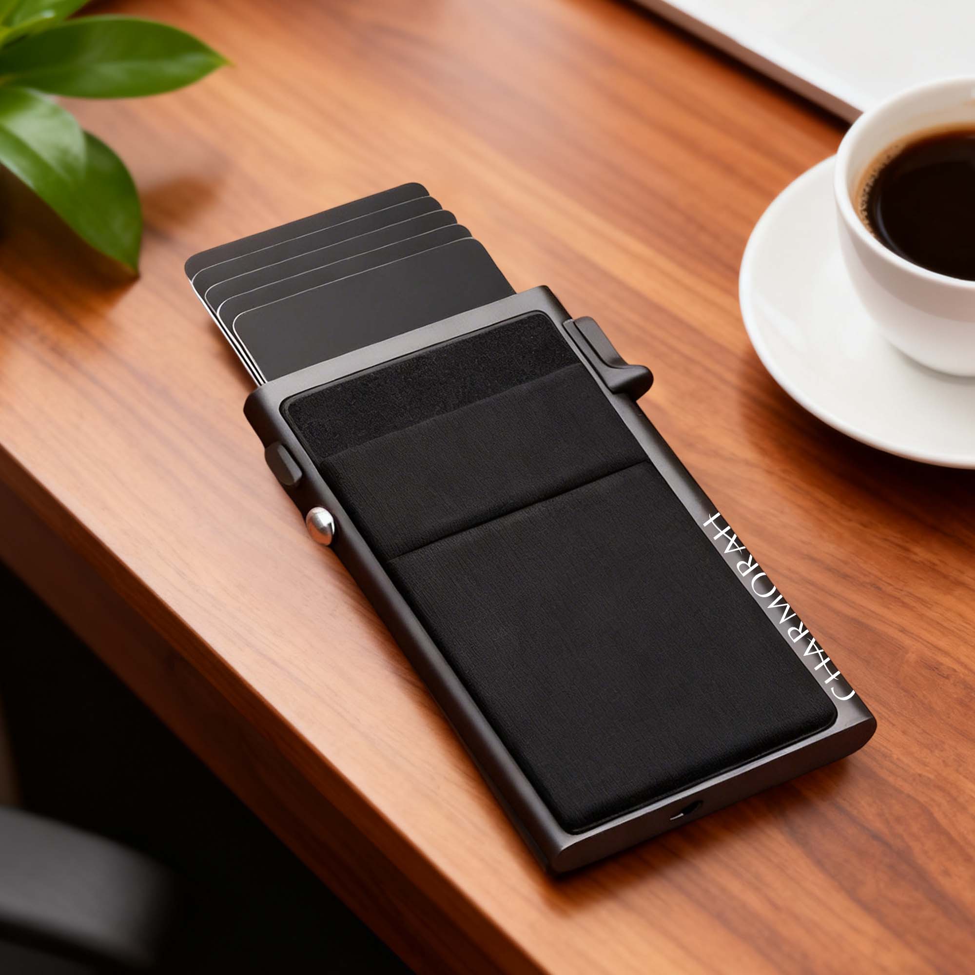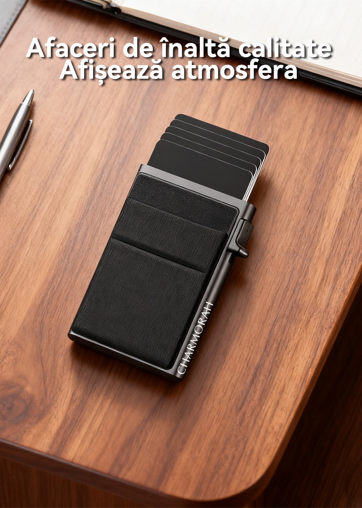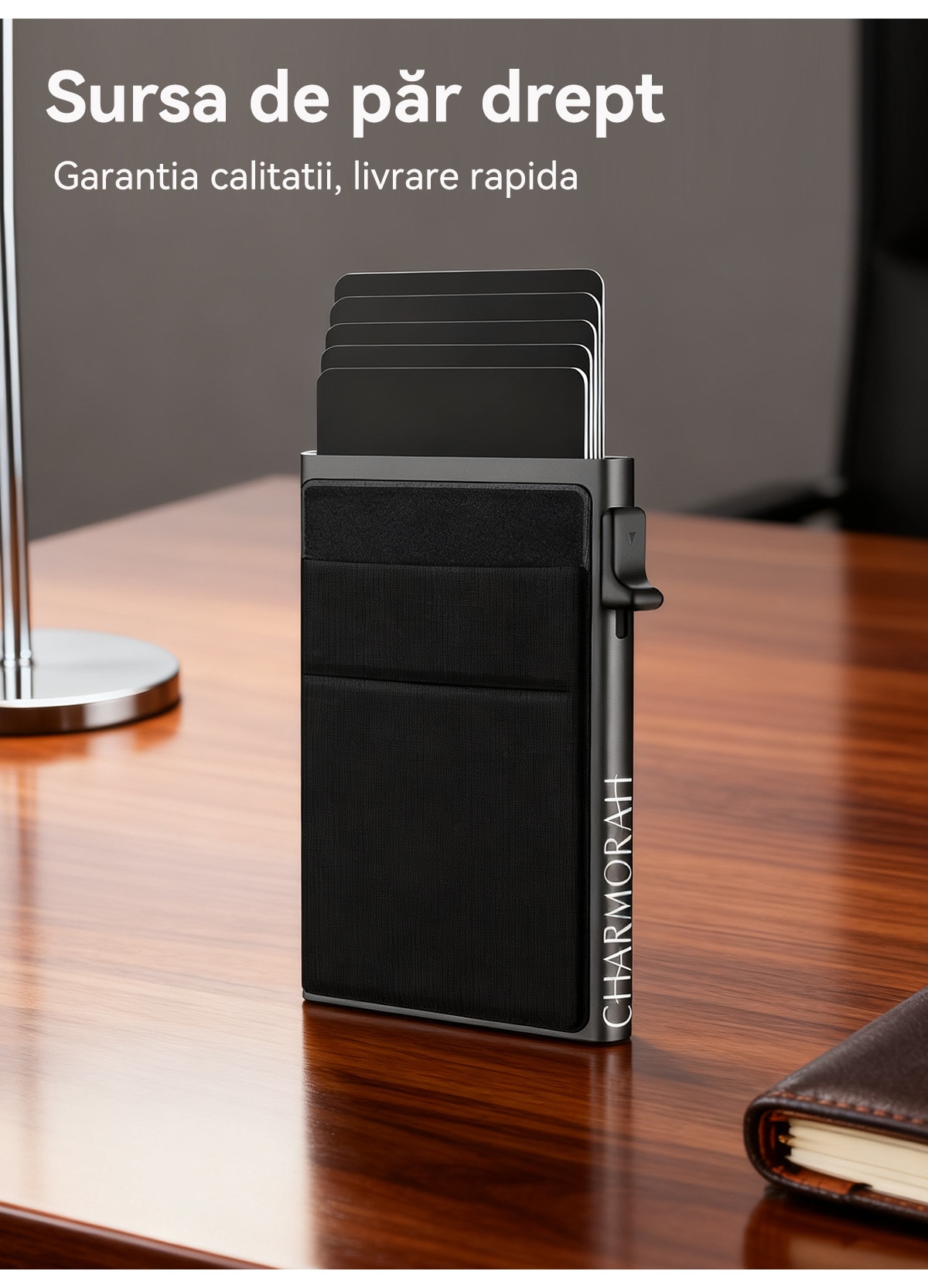 Charmorah - Portofel subtire din aluminiu pentru carduri, Suport de card pop-up, Negru