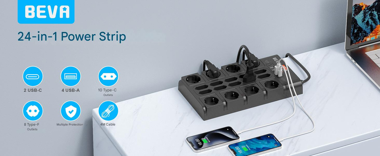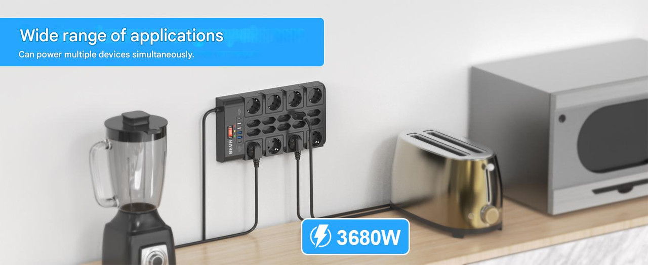 Prelungitor 24 in 1: Cu 8 prize CA de tip F si 10 prize CA de tip C (putere: 16A/3680W), 4 porturi USB-A (maxim 2,4A, total 4,8A) si 2 porturi USB-C (5V/3A), acest multi-priza ofera mult spatiu pentru mai multe dispozitive simultan. Acest multi-priza poate alimenta 24 de dispozitive simultan. Poate satisface o varietate de aplicatii casnice si de birou. Alegeti acest super multi-priza care are suficient spatiu pentru toata lumea!