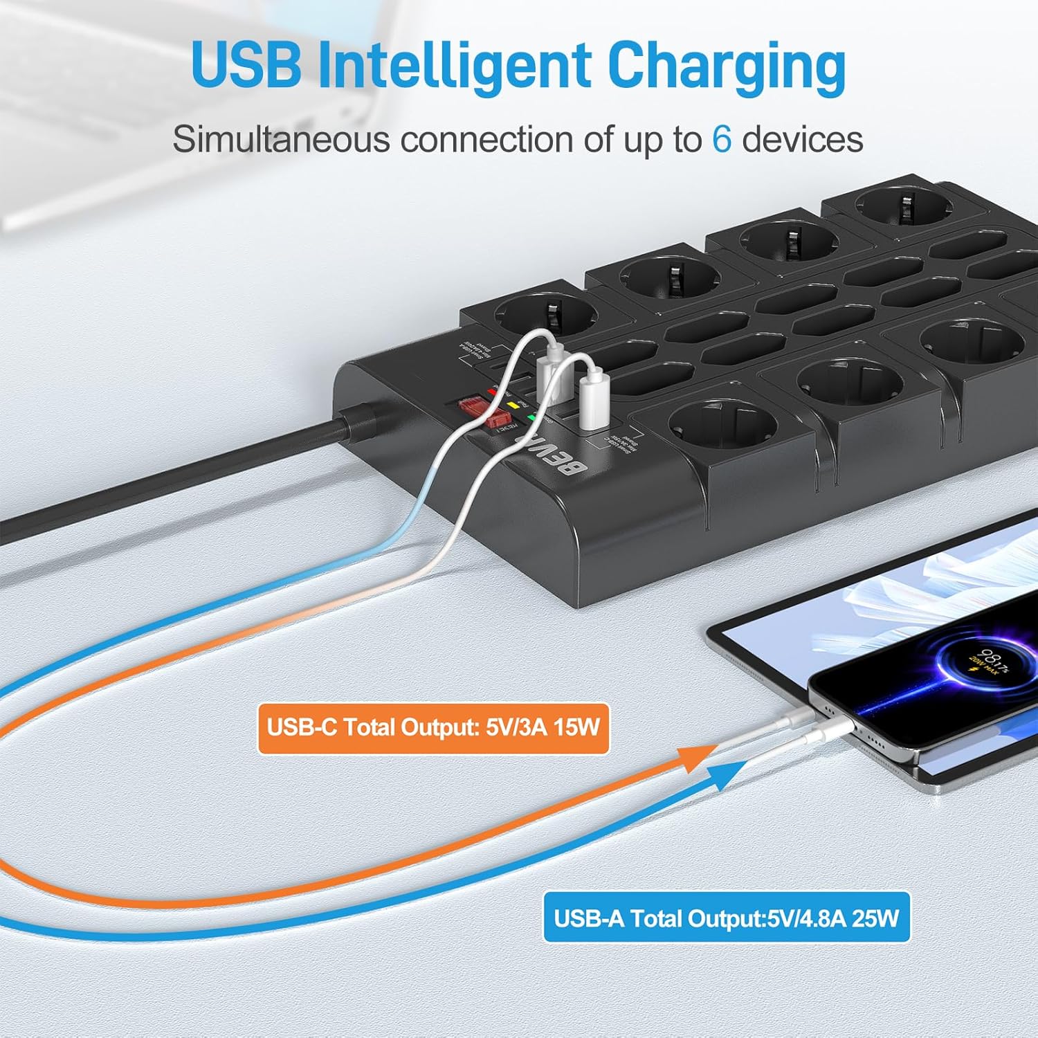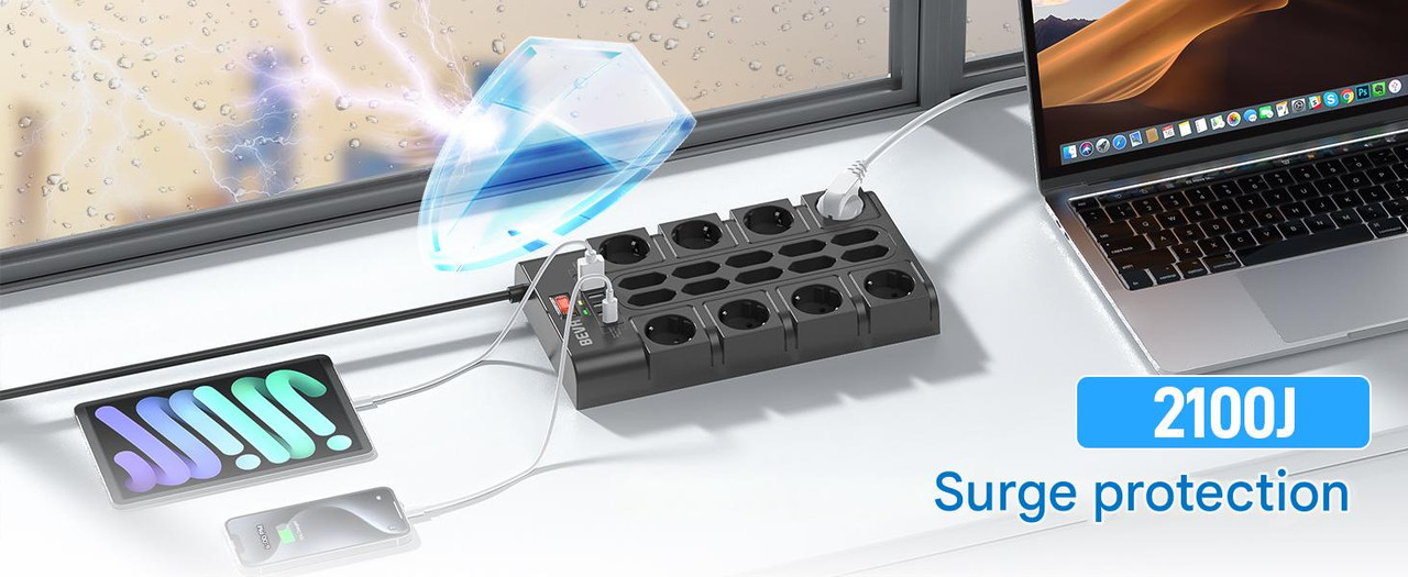 Protectie la supratensiune: Pana la 2100 jouli. Mii de gospodarii isi pierd electronicele scumpe in timpul furtunilor in fiecare an. Cu o energie nominala de 2100 jouli pentru protectie, multi-priza USB cu protectie de inalta calitate impotriva trasnetului va poate alimenta in siguranta computerul, televizorul, telefoanele mobile, lampa si sistemul audio. Protejeaza dispozitivele electronice valoroase de varfuri de curent, trasnete sau fluctuatii in timpul ploii abundente si al fulgerelor.