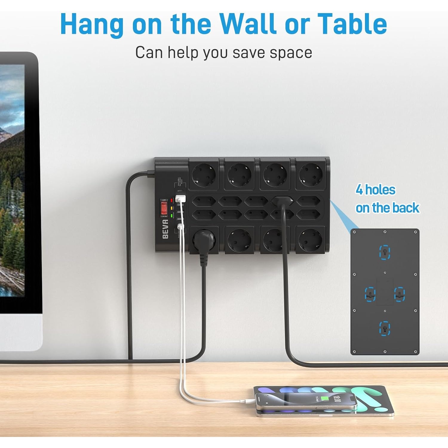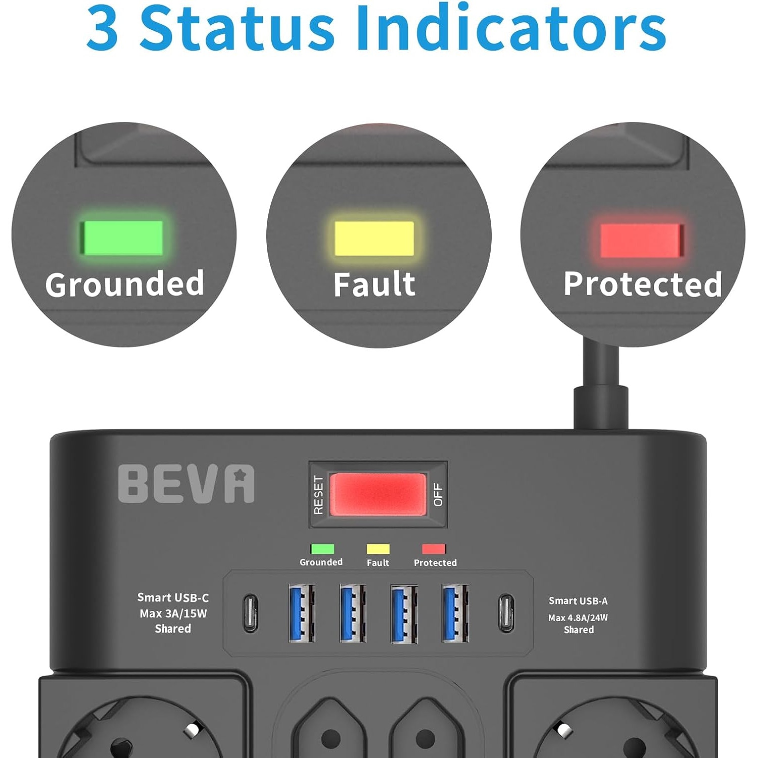 Design atenta: 1. Design de montare pe perete cu 2 optiuni de montare. Pe spate exista 4 orificii pentru cheie pentru montare orizontala sau verticala. (4 suruburi incluse in pachet.) 2. In plus, prizele sunt aranjate la un unghi de 45°, ceea ce poate economisi spatiu. 3. Cu indicator de stare. Detectati starea de functionare dintr-o singura privire cu afisajul de stare in 3 culori. Rosu pentru protectie la supratensiune, verde pentru protectie la impamantare si galben pentru indicarea defectiunii. In conditii normale, becurile verde si rosu se aprind. Daca becul galben se aprinde, a aparut o eroare, de ex. B. daca dispozitivul nu este impamantat sau consuma mai mult decat puterea nominala.