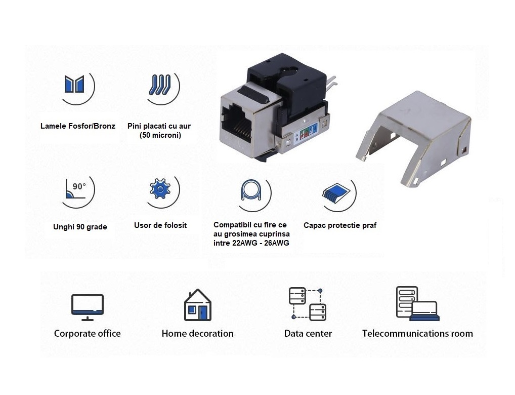 | Continut pachet | 1 x conector FTP cat6 (keystone jack) ecranat 1 x priza neechipata 1 port cu capac antipraf Suport dublu adeziv + suruburi pentru fixare |