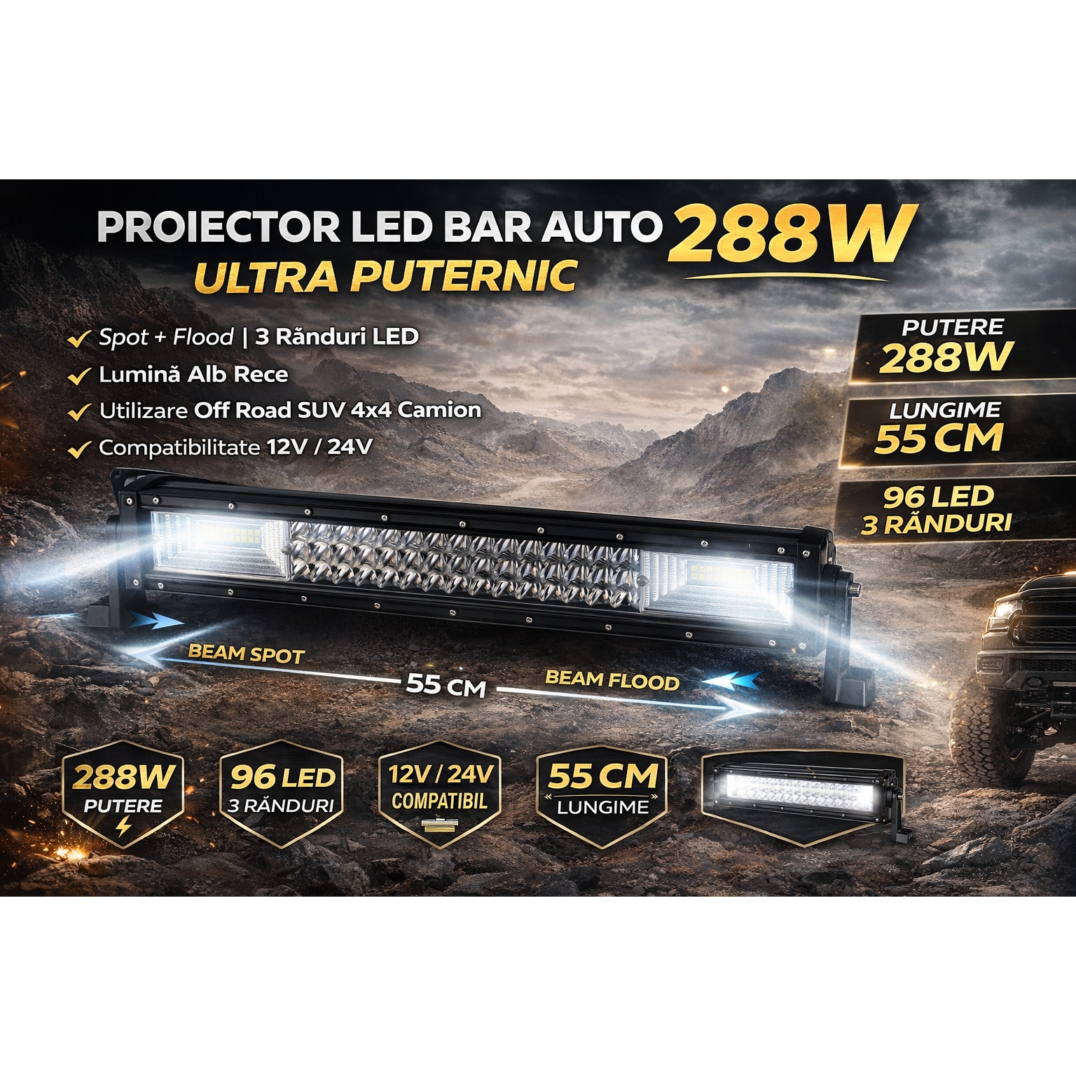 Proiector LED Bar Auto 288W, 96 LED, 55 cm, 12V-24V, Off Road 3 Randuri Spot + Flood, Lumina Alb Rece – SUV 4x4 ATV Camion Utilaje