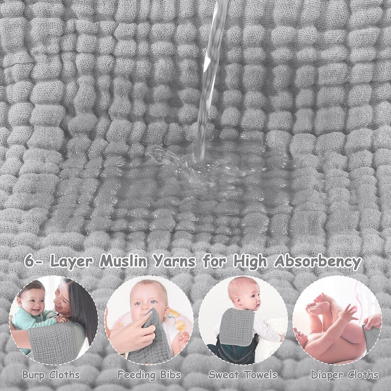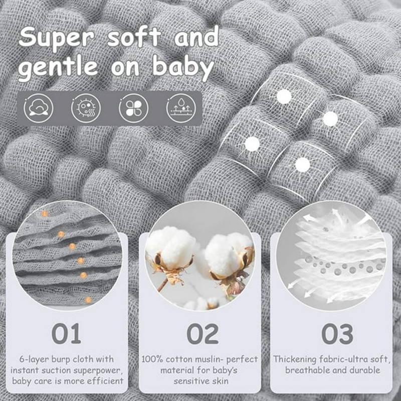 Aceste carpe de muselina moi si absorbante sunt realizate din bumbac 100% natural, oferind o optiune blanda si confortabila pentru micutul tau. Cu un design cu 6 straturi, absorb in mod eficient mizeria si scurgerile, in timp ce dimensiunea mare de 20" x 10" ofera o acoperire larga. Potrivite pentru a fi folosite ca carpe pentru burp, carpe de spalat, bavete si chiar prosoape de perna, aceste carpe versatile sunt lavabile la masina si se pot spala manual pentru o ingrijire usoara. Creat pentru confortul bebelusului tau, designul unisex ii face o alegere excelenta atat pentru fete, cat si pentru baieti.