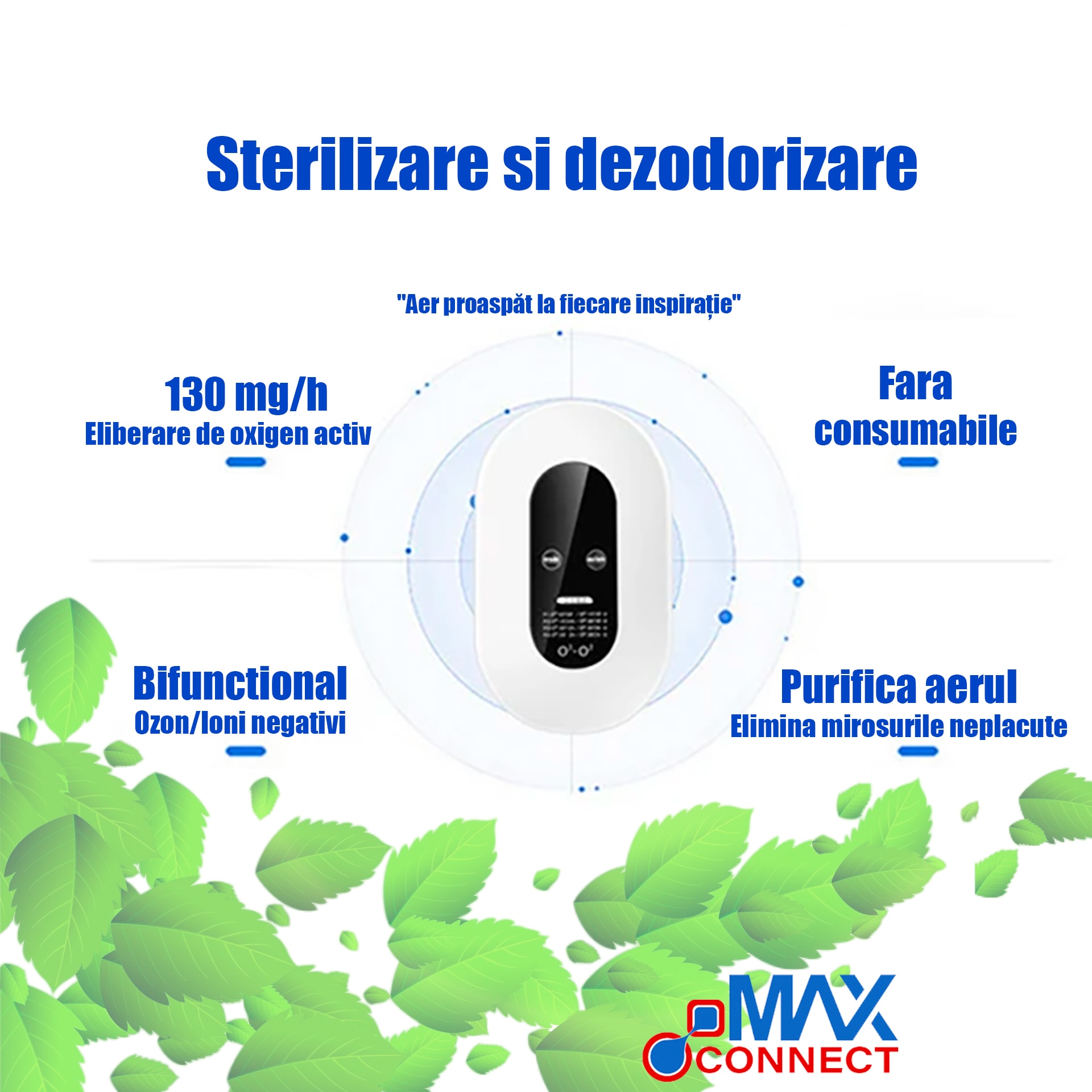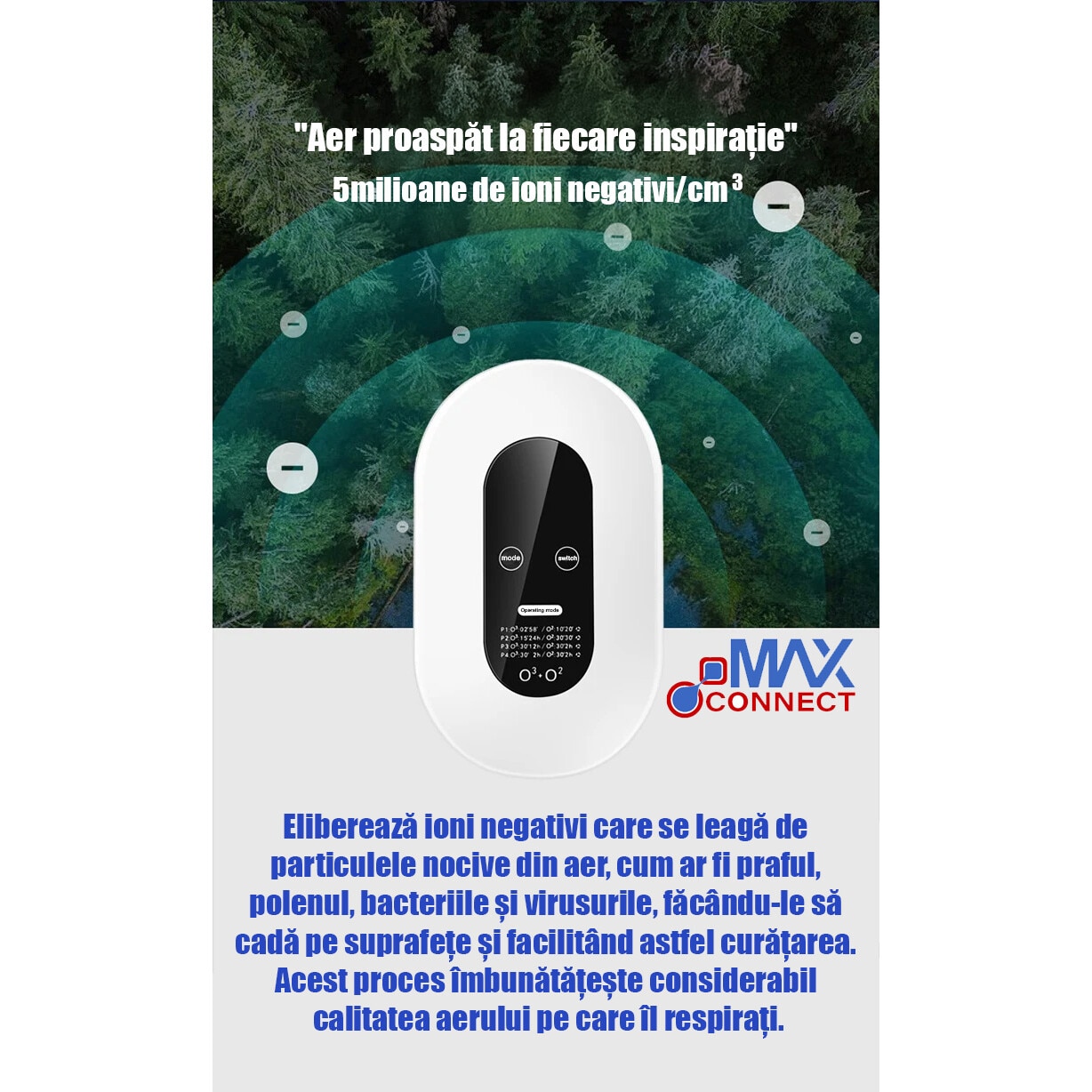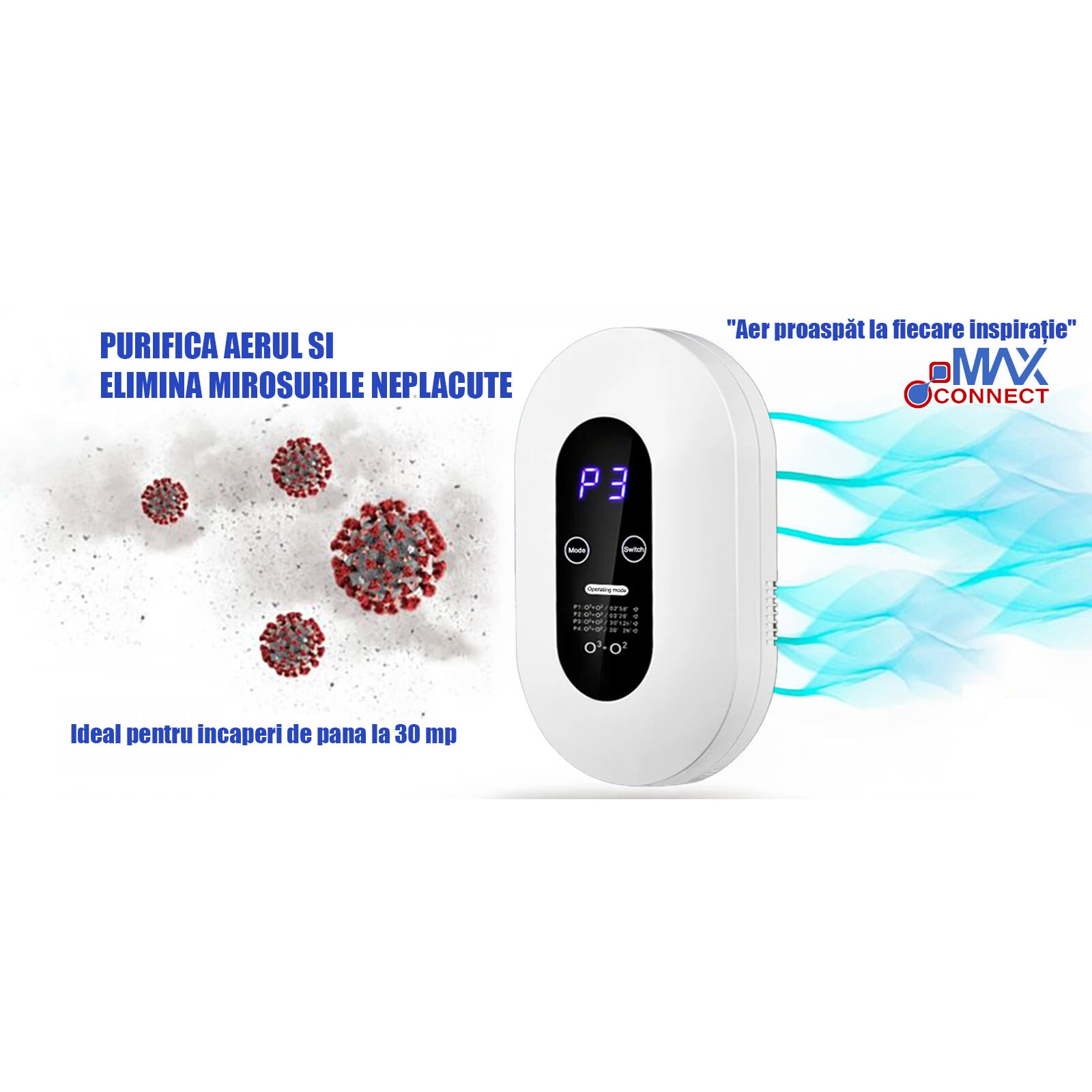 Purificator de aer cu ozon, MAX CONNECT, 5W, 130mg/h, pentru suprafete de pana la 30 mp, 4 moduri functionare, LCD, mini generator de ozon, 5 milioane de ioni negativi, alimentare 220V, alb