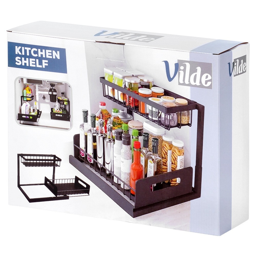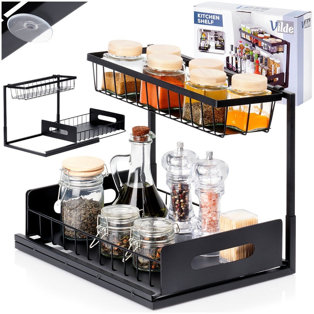 Raft De Bucatarie Cu Sertar Glisant, Vilde, 36x27x28.5 cm, Raft De Depozitare Pe Doua Niveluri, Metalic, Vopsit Electrostatic, Cosul Inferior Poate Fi Scos, Potrivit Pentru Dulapuri, Sub Chiuveta Si Pe Blat, Negru