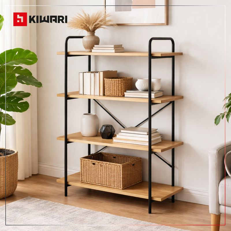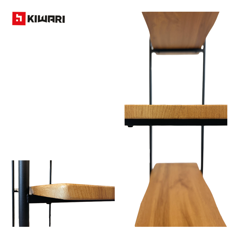 Raft Kiwari® Quad, 4 polite, 112×34×80 cm, MDF si Metal, Design Modern Industrial, Negru & Stejar