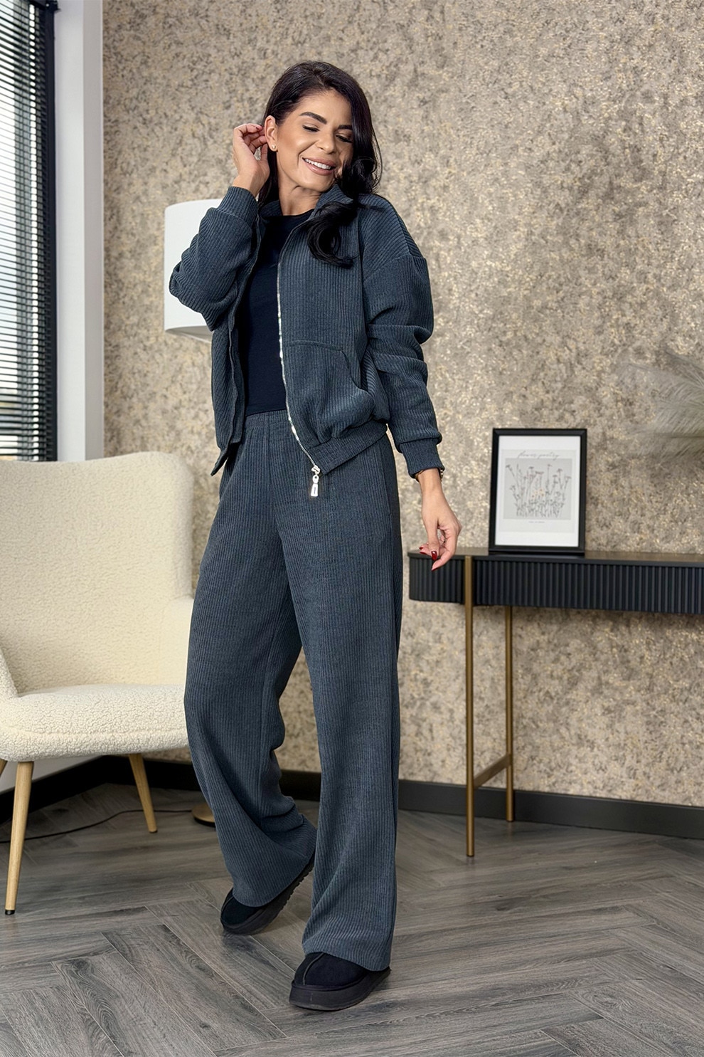 Ramona Badescu Exclusive, Set de bluza si pantaloni de trening striate Emira, Gri carbune