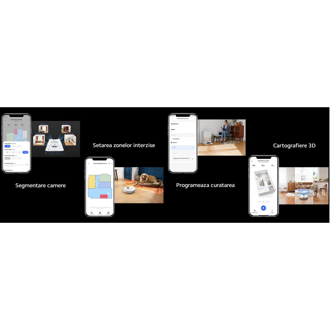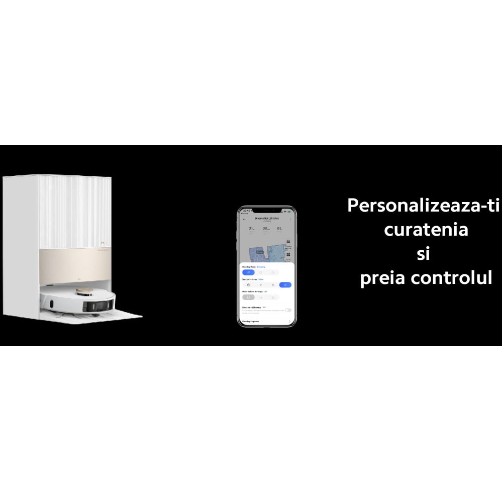 Descarca noua aplicatie din App Store sau Google Play pentru cea mai buna experienta Dreame-home. Preia controlul prin intermediul aplicatiei pentru a-ti personaliza curatenia in functie de casa si programul tau. Segmenteaza camerele, creeaza pereti virtuali, seteaza zone interzise sau programeaza curatenie, totul din confortul telefonului tau.