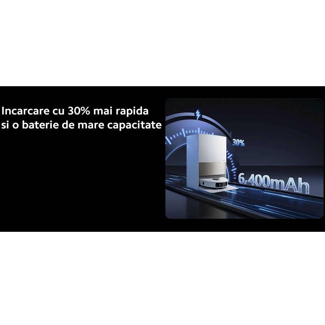 Tehnologia avansata Dreame creste enorm viteza de incarcare a bateriei mari de 6.400 mAh, pentru a asigura ca robotul tau este gata rapid pentru urmatoarea sesiune de curatare.