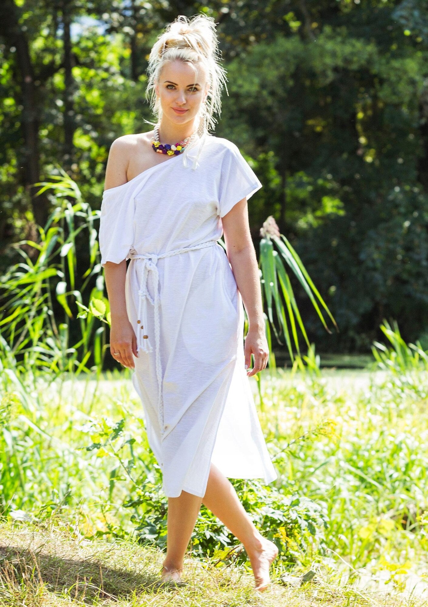 Rochie lejera, cu maneci scurte, din tricot moale de bumbac. Are un decolteu barca si un decupaj in forma de V pe spate, datorita caruia poate fi alunecat peste un umar. Lungime de la jumatatea gambei. Fante pe laterale. Curea inclusa.