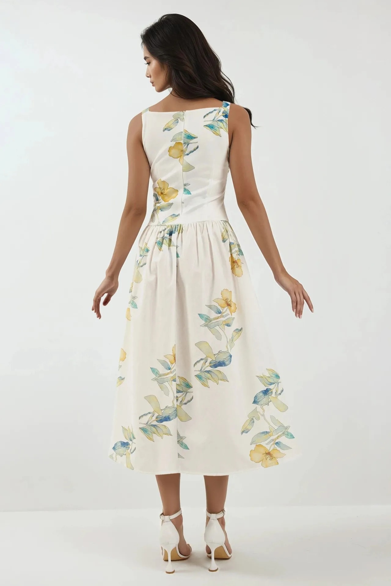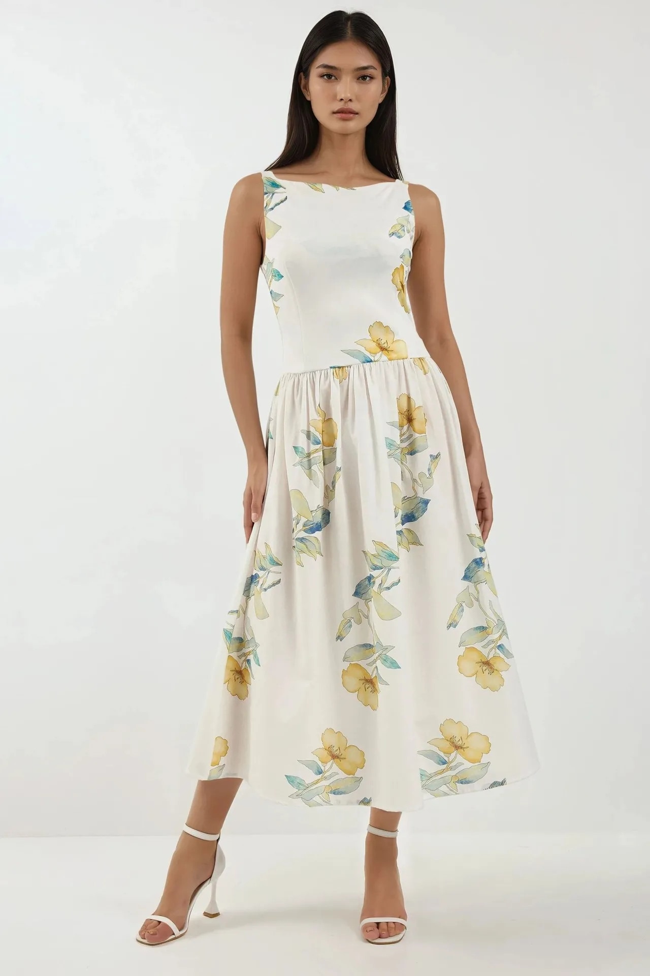 Rochie midi, HiCCUP, imprimeu, decolteu barca, alb, textil