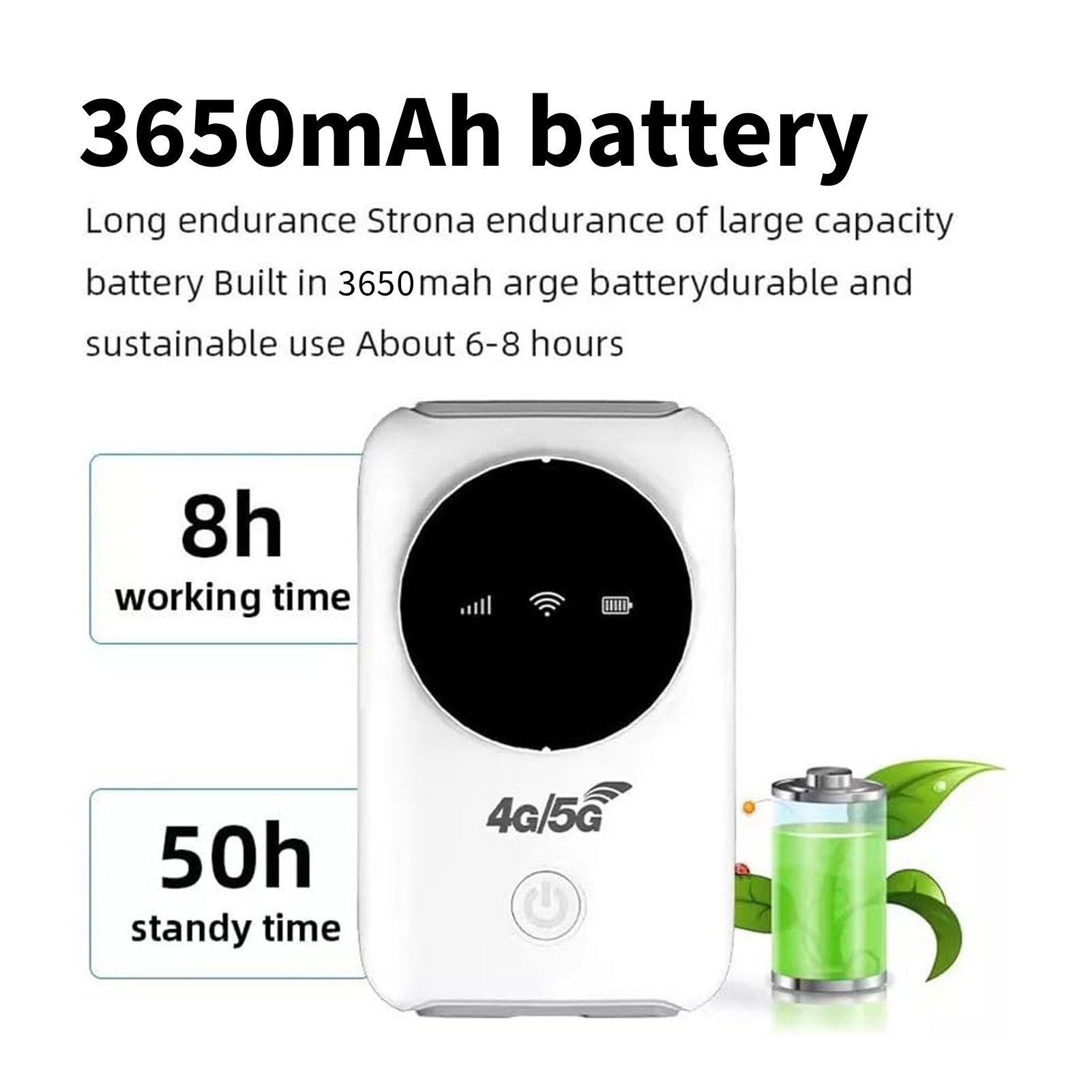 Durata lunga de utilizare: Routerul wifi multifunctional este echipat cu o baterie reincarcabila de 3650 mAh, care poate fi utilizata timp de 8 ore si ofera un timp de standby de peste 50 de ore. Pur si simplu introduceti o cartela SIM standard. (Cartela SIM nu este inclusa).