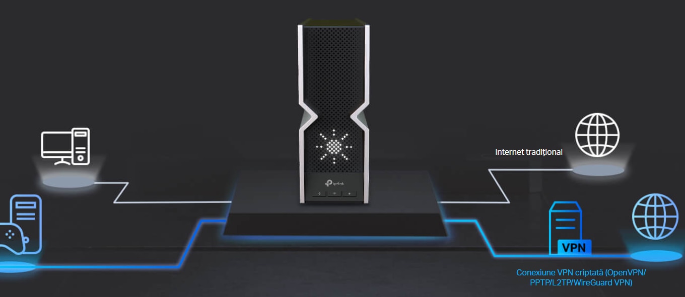 Salut, iti multumim pentru interesul acordat produselor TP-Link. Routerul dispune atat de server VPN (OpenVPN, L2TP, PPTP, WireGuard) cat si de client VPN (poate fi client la orice server care utilizeaza aceleasi protocoale mentionate anterior) 😀. Daca te putem ajuta cu informatii aditionale, nu ezita sa ne contactezi telefonic sau prin email: www.tp-link. Com/ro/support/contact-technical-support/ Editează