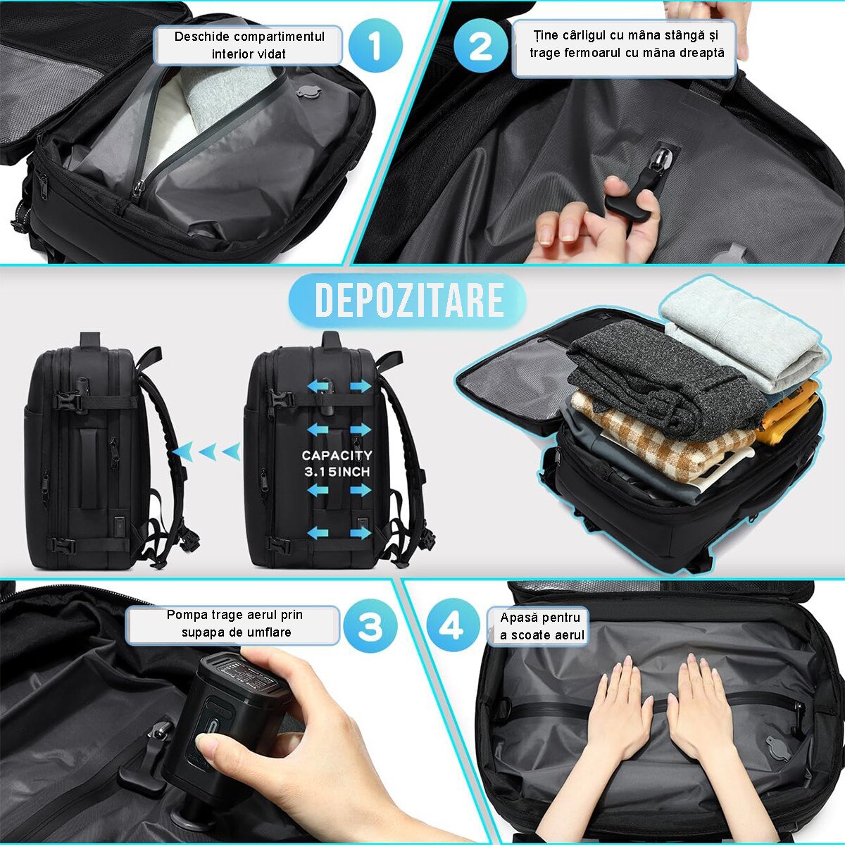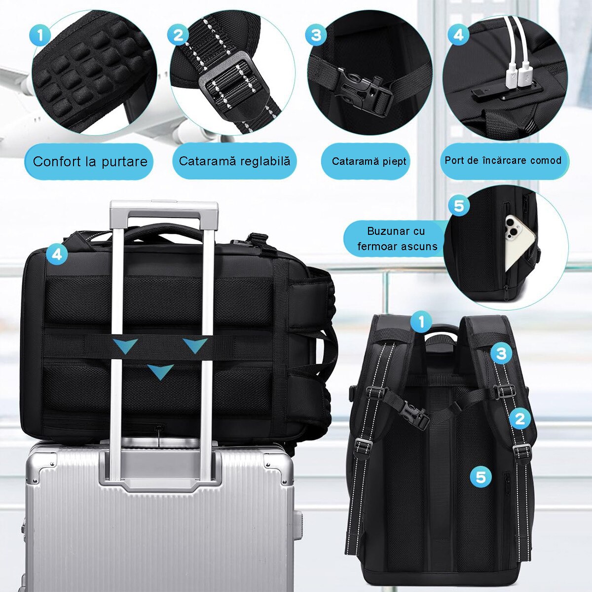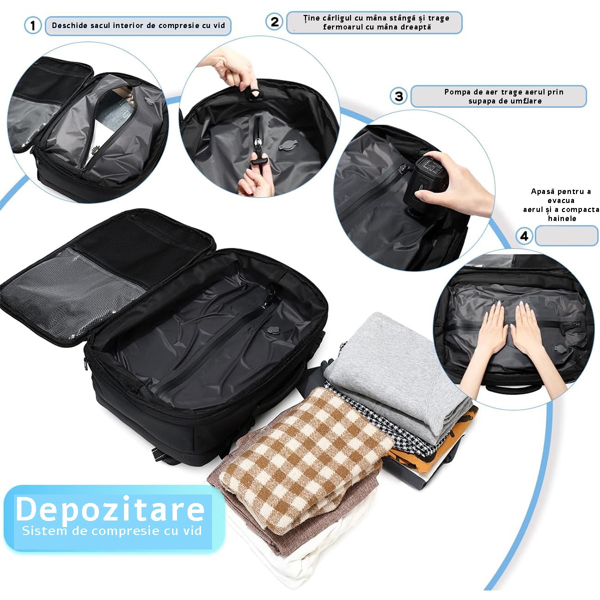 Rucsac Calatorie JOYSTOS 60L, Extensibil cu Compresie Vacuum, Compartiment Laptop 17", Port USB, Antifurt, Impermeabil, Bagaj de Mana Avion, Buzunar Fata Orizontal