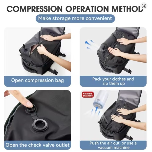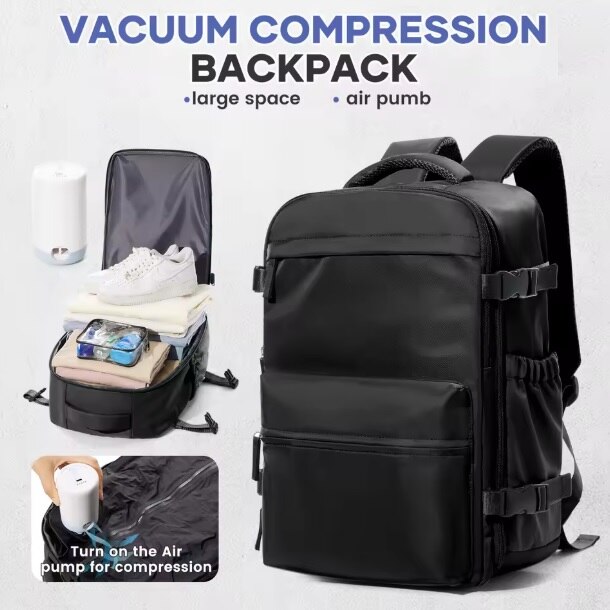 Pompe de vid - Rucsacul vine cu o pompa de vid portabila care este usor de transportat. De asemenea, vine cu diverse accesorii de conectare la pompa, care pot satisface diferite nevoi de pompare, fie pentru comprimarea rapida a bagajelor sau pentru reglarea spatiului de ambalare, iti ofera un confort deosebit.