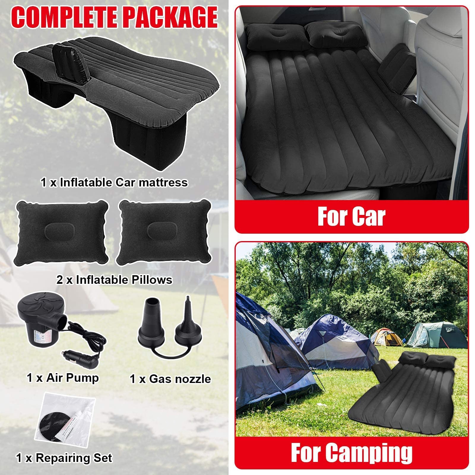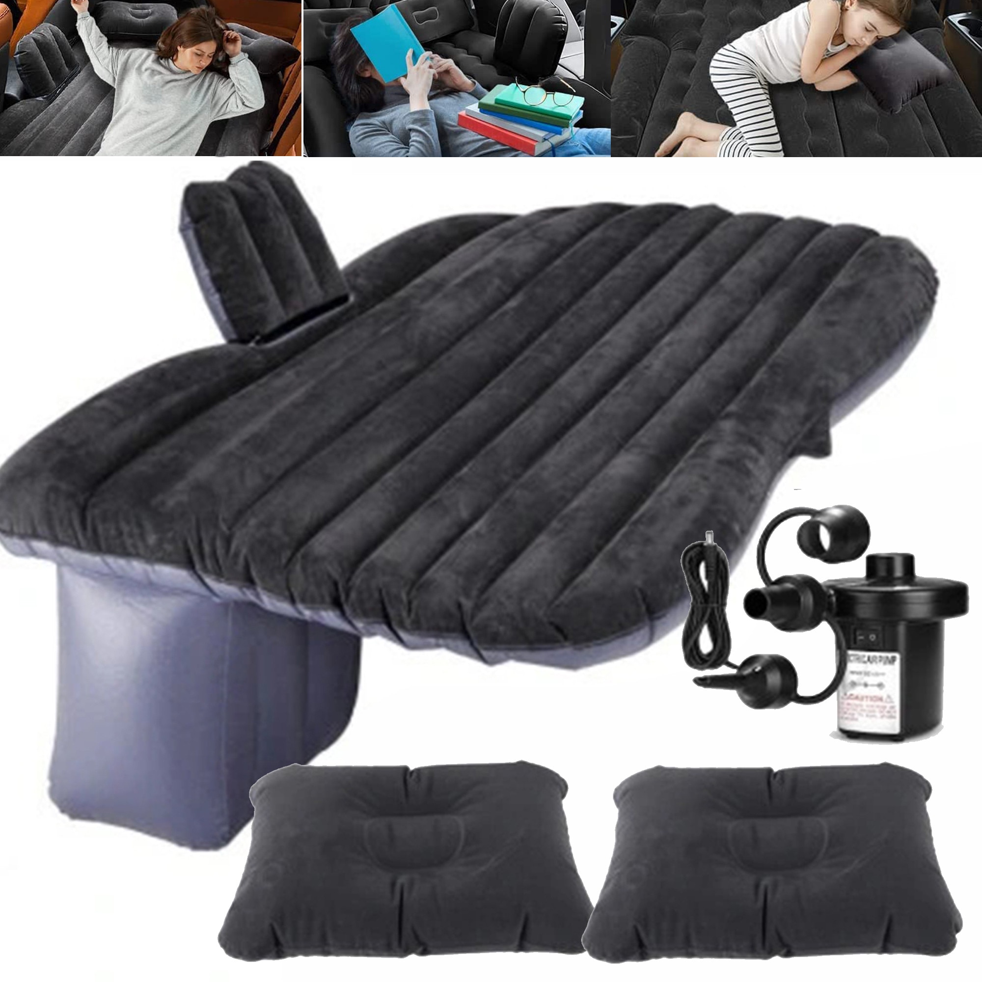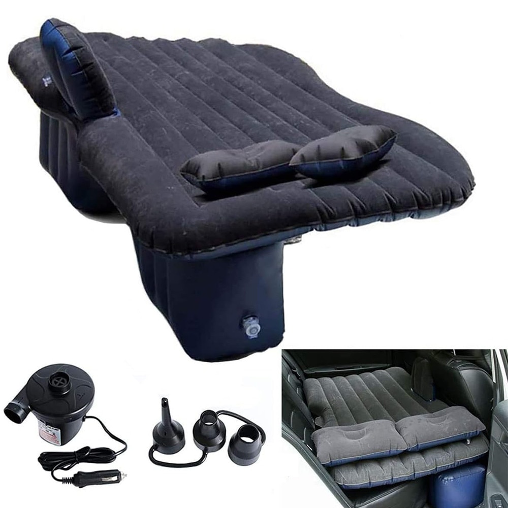 Saltea Auto Gonflabila, pentru bancheta masina, 135x80x45cm, set cu 2 perne, pompa electrica 12V, negru si albastru, pentru camping si calatorii