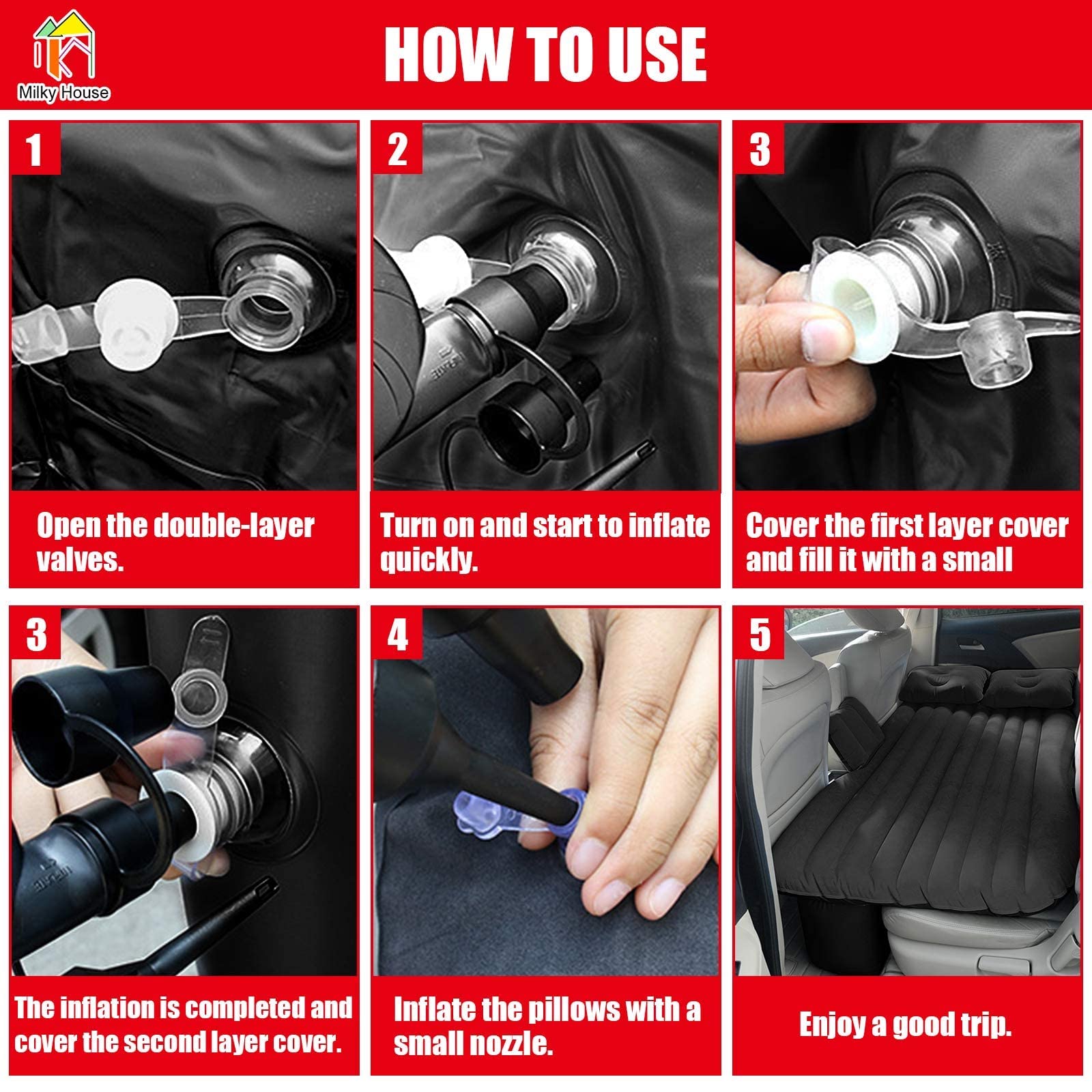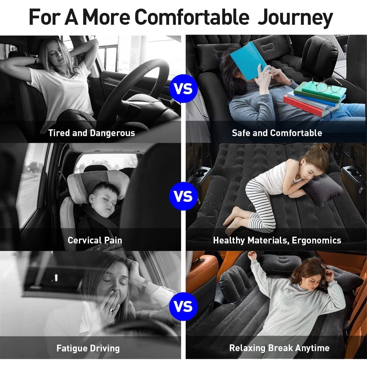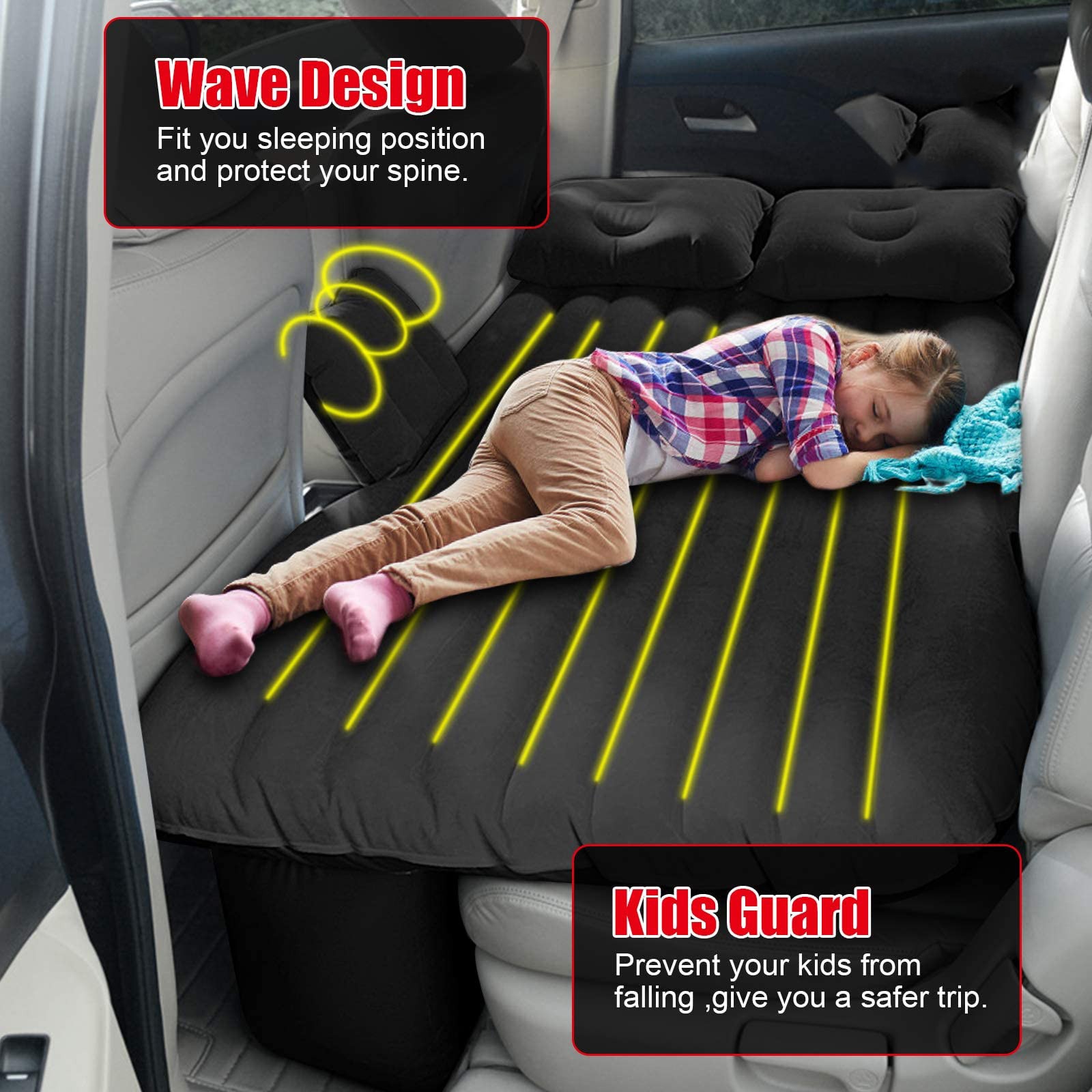 Saltea Auto Gonflabila, pentru bancheta masina, 135x80x45cm, set cu 2 perne, pompa electrica 12V, negru si albastru, pentru camping si calatorii