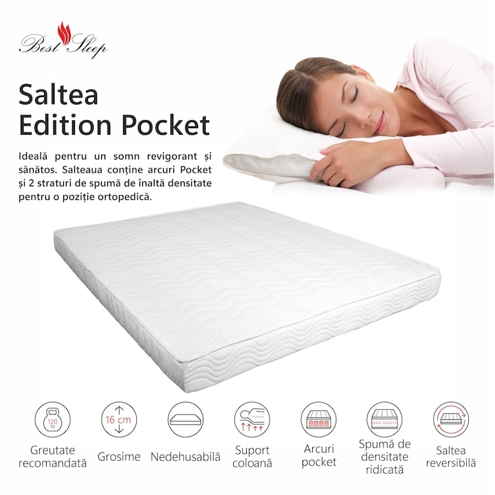 Salteaua BEST SLEEP Edition Pocket, 120x190x16cm, cu arcuri individuale, hipoalergenic, antibacterian, ferma mi-a depășit așteptările. Aveam nevoie în mod special de o saltea cu o fermitate medie + iar aceasta este perfectă. Oferă un suport excelent fără a se simți prea tare, iar stratul de spumă îmi înconjoară corpul, ameliorând punctele de presiune, în special pe șolduri când dorm pe o parte.
