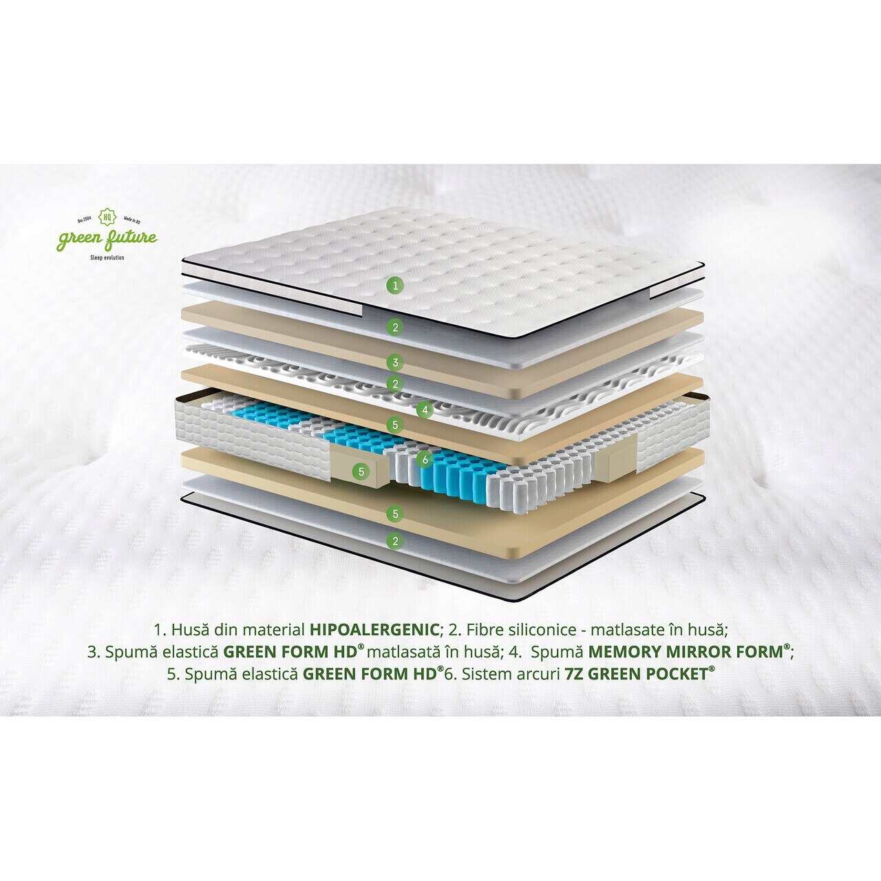 Tehnologia avansata a sistemului de Arcuri 7Z Green Pocket® impreuna cu cea a stratului de Green Therm Memory® asigura un somn fara propagarea miscarilor.
