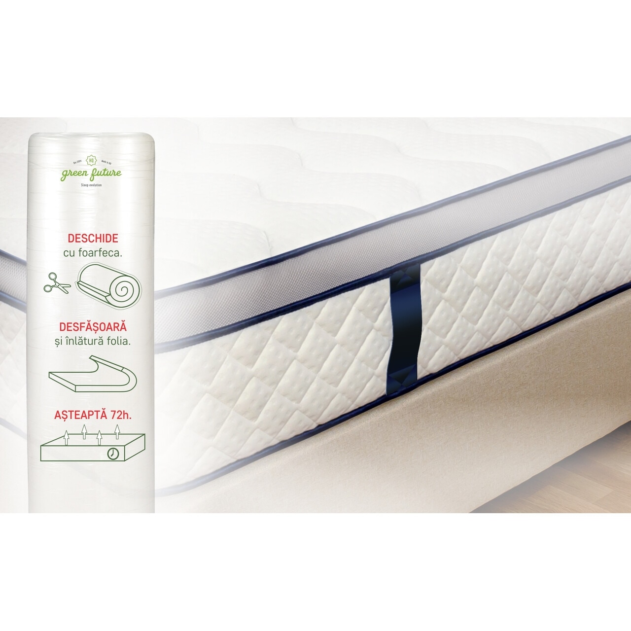 - desfaceti cu grija folia de protectie, fara a folosi cutitul sau alte obiecte taioase care ar putea deterioara tesatura saltelei.