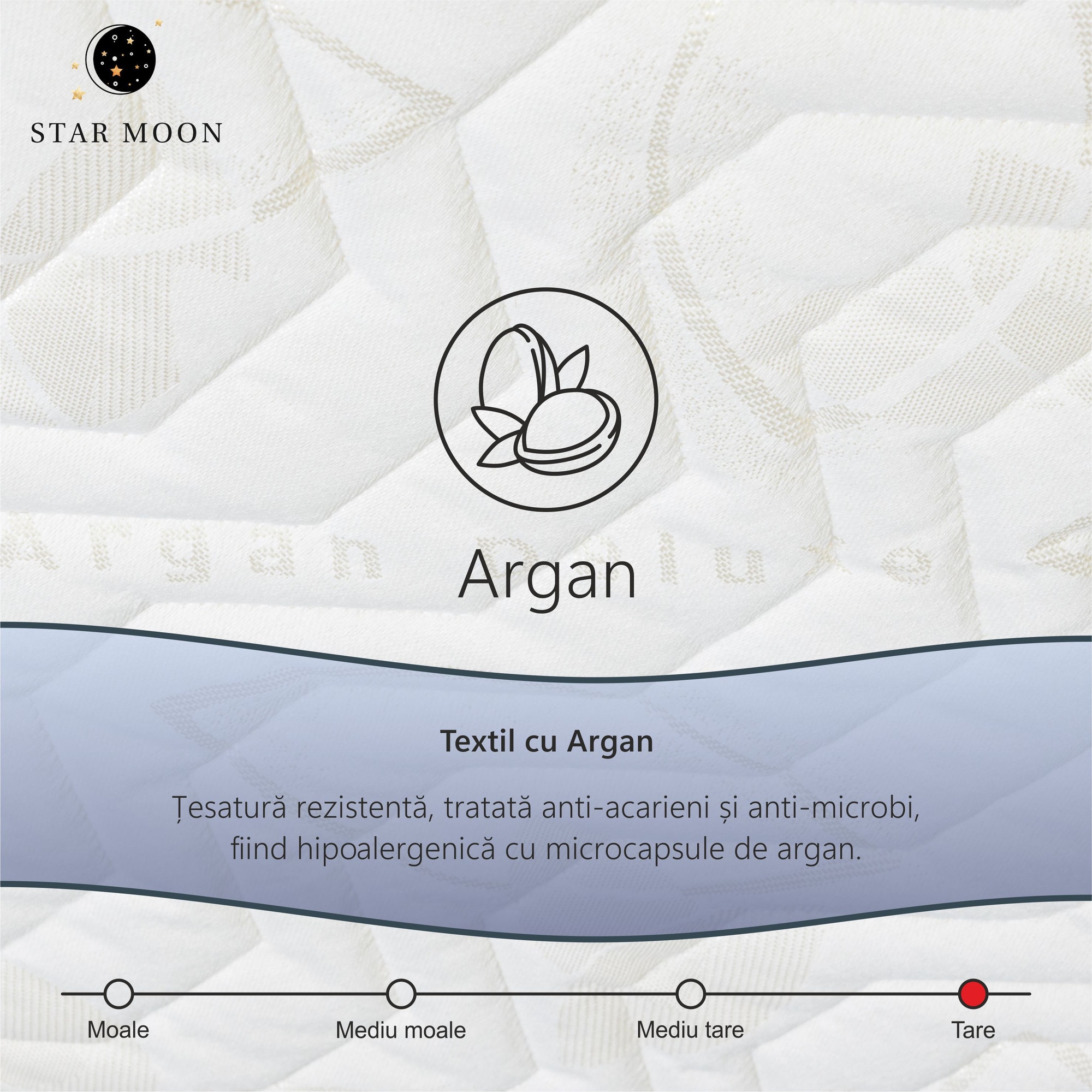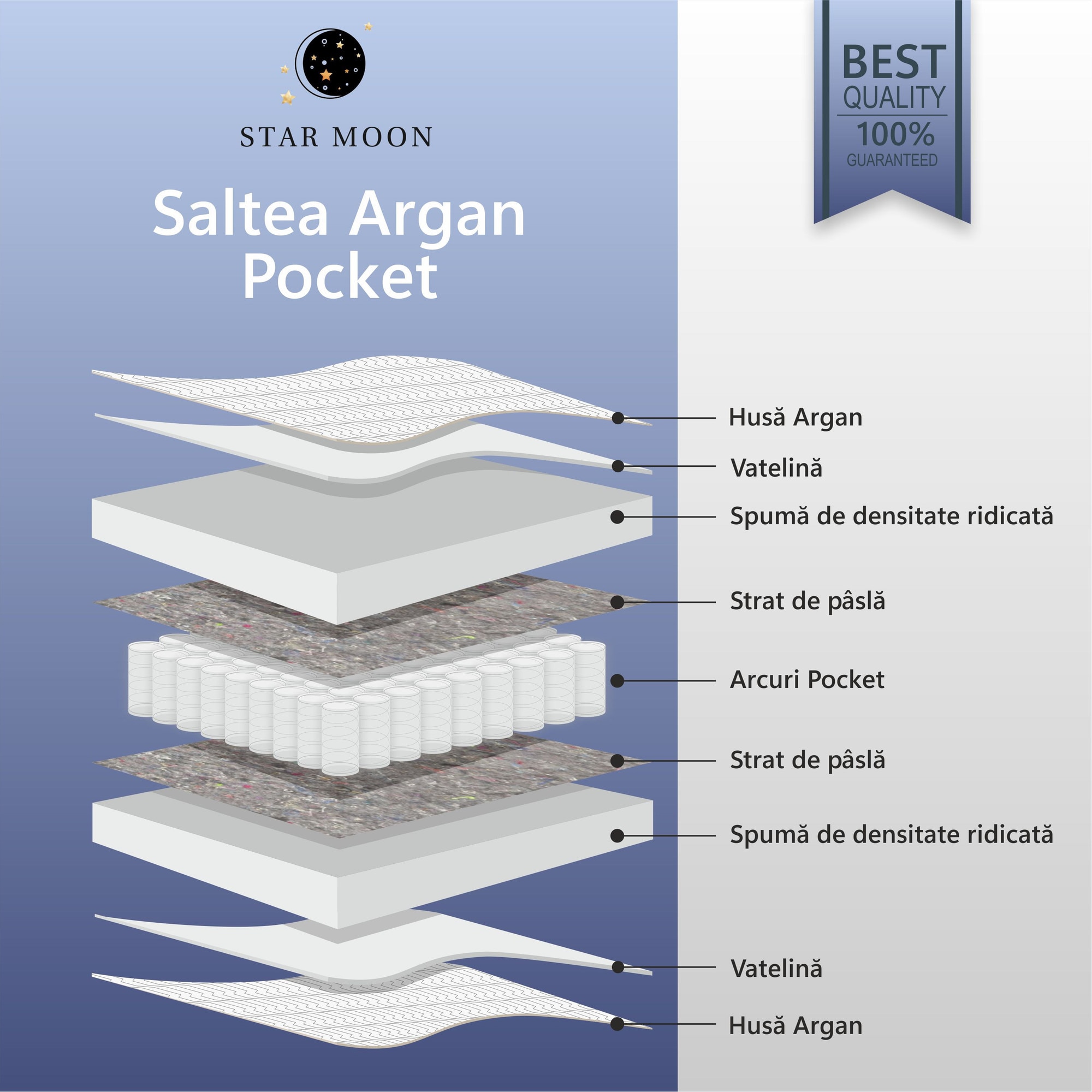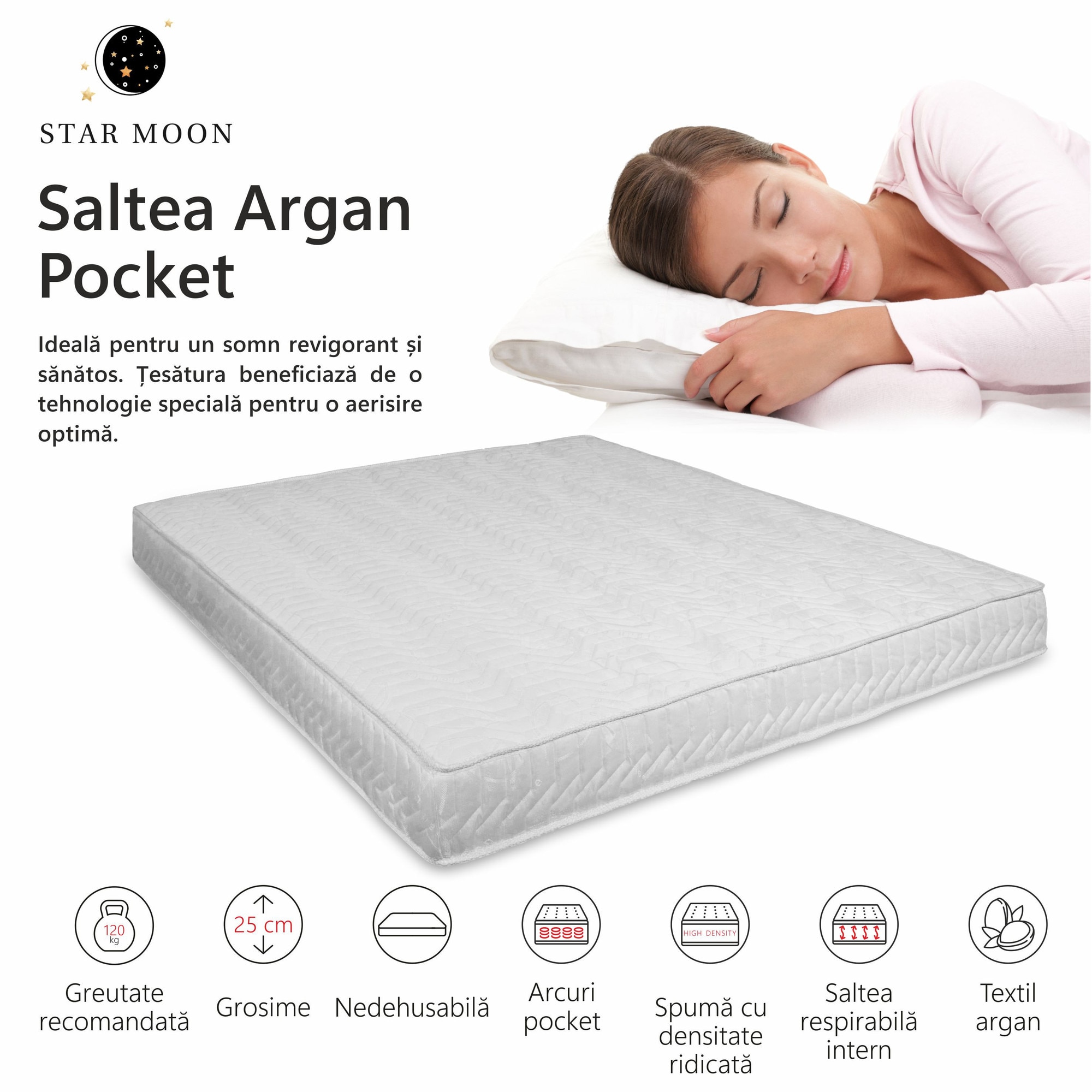 Saltea Ortopedica, Star Moon, Argan Pocket 80x200x25 cm, spuma poliuretanica, arcuri ambalate individual, fermitate medie