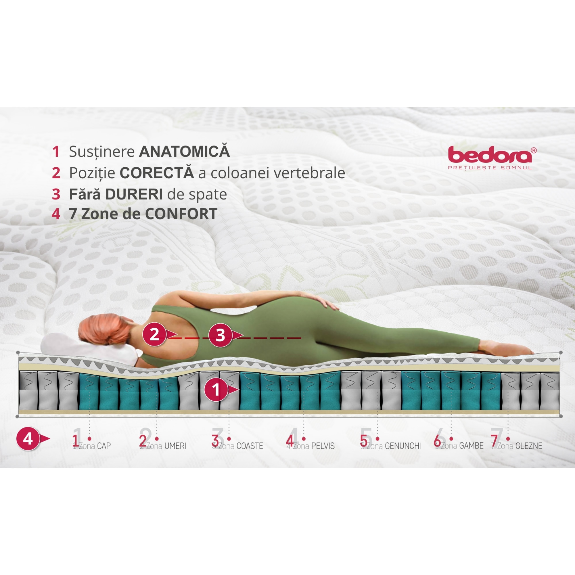 In plus, sistemul 7Z Green Pocket® permite un suport diferit al partilor corpului in functie de presiunea exercitata de acestea pe suprafata saltelei pentru a asigura o aliniere corecta si sanatoasa a vertebrelor coloanei.